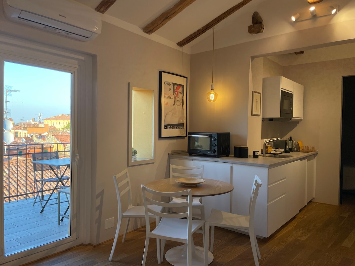 This attic is located on the top floor of a typical Bolognese building from the early 1900s, entirely renovated in 2022. The uniqueness of this attic lies in having dual terraces, allowing one to have breakfast or lunch outdoors while enjoying the marvelous panorama of the historic center of Bologna. The location is very quiet, central, well-served, and just a ten-minute walk from Piazza Maggiore.