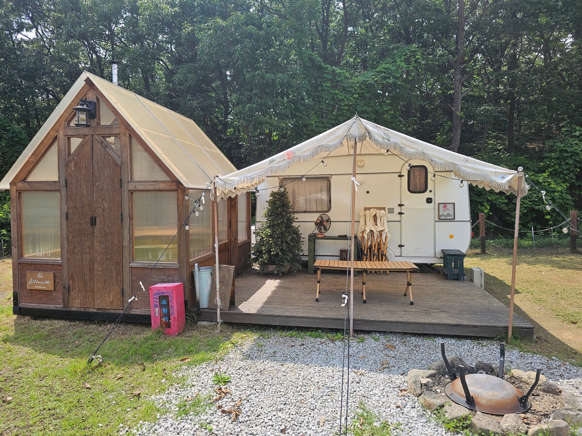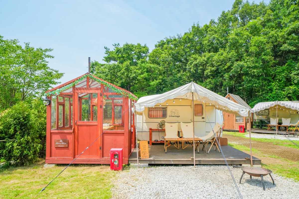 You'll love this romantic place with a unique personality. Small town in the woods, 'Urban Antique' emotional caravan campsite! This is a natural campsite that can be enjoyed in Gyeonggi-do, near Seoul. You can enjoy it more emotionally because we imported a vintage caravan that is hard to find in Europe and remodeled it by hand. All the grass in Urban Antique is made of natural grass, and since it is surrounded by Goryeosan in Gangneungdo, you can experience a quiet and more relaxing natural healing. We will do our best to make your day at Urban Antique the best memory. -Instagram emotional photos, fire, views, star, atmosphere, restaurants - Individual barbecue in front of the caravan - Cooling and heating are working perfectly! - Glamping where you only need to bring food and water -Free rental of cute emotional plates and cups, flower accessories, etc.
