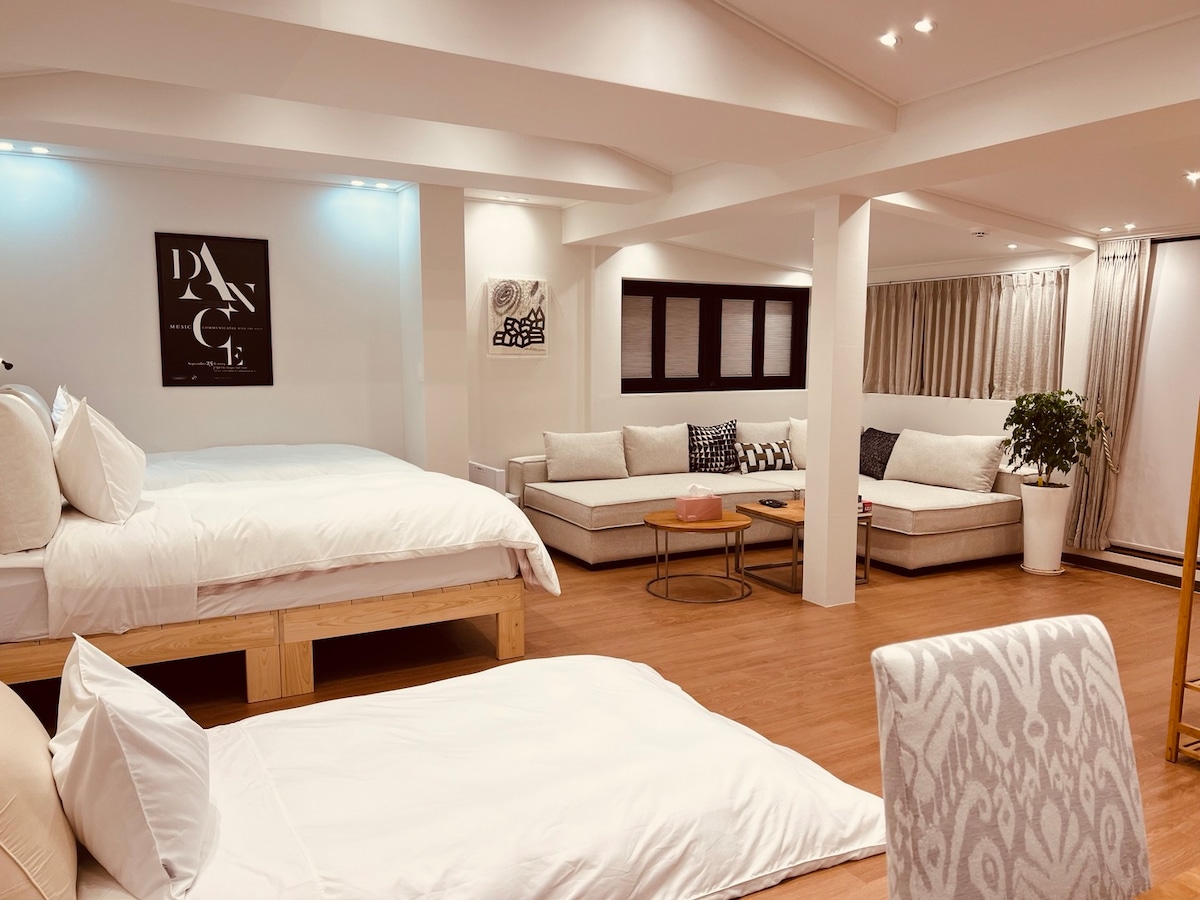 ★Follow Goverment rule limiting Gathering number of people until Pandemic is gone. ★CORE of Hongik Univ(Hongdae) Area★ ★Short & Direct Airport Railway★ ★Just 1 minutes from Hongdae Univ Station exit#5. clean street Beside Park ★A large spacious room for 6~7People (max 10 people) * 4F+5F rooftop ★Garden & BBQ★ ★Wifi ★Hotel-style bedding ★Communication possible in all English, Chinese, and Korean ★Small Luggage placing in 3F locker from 12PM ★3PM check-in. 11AM check-out