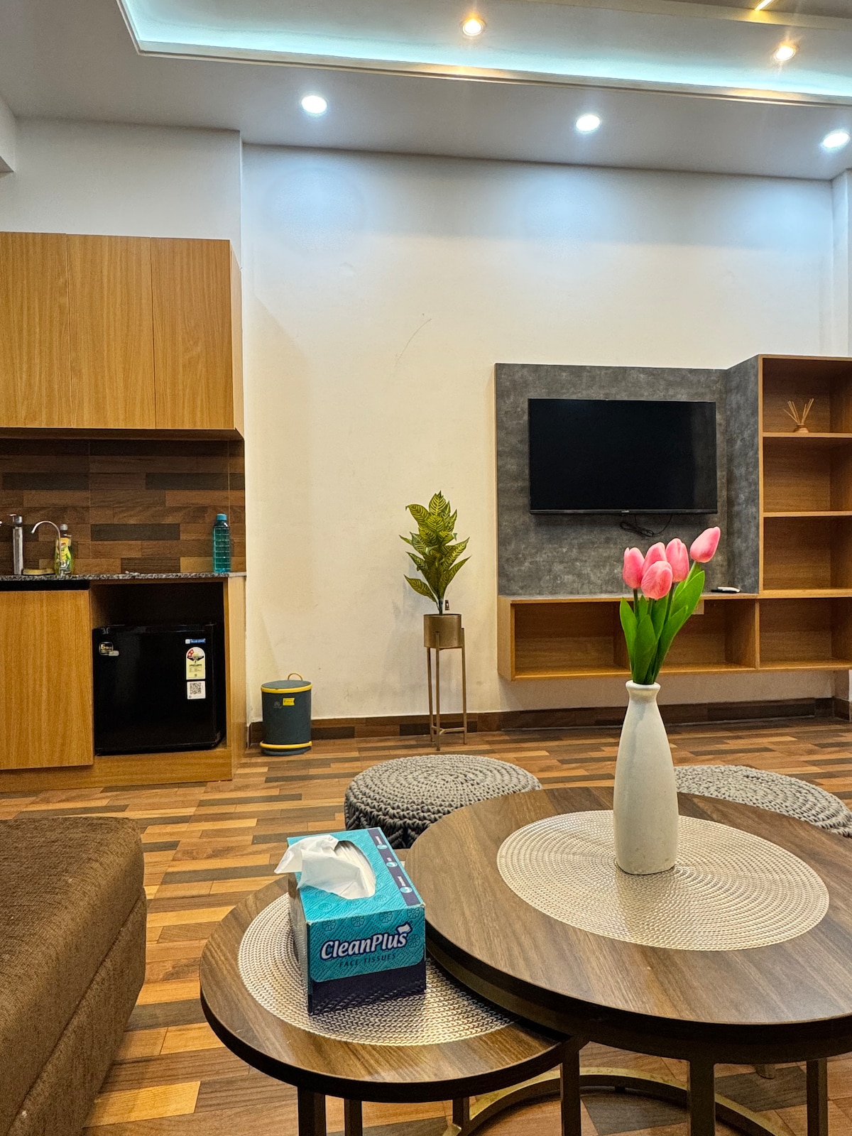 Nilaaya offers a warm and comfortable stay with a cozy double bed, a welcoming living area with a smart TV, and a practical kitchenette for light cooking. The studio includes a wardrobe, luggage rack, and a neat, well-maintained washroom. Start your day at the stylish breakfast counter and enjoy all the essential amenities you need for a relaxed and convenient experience.