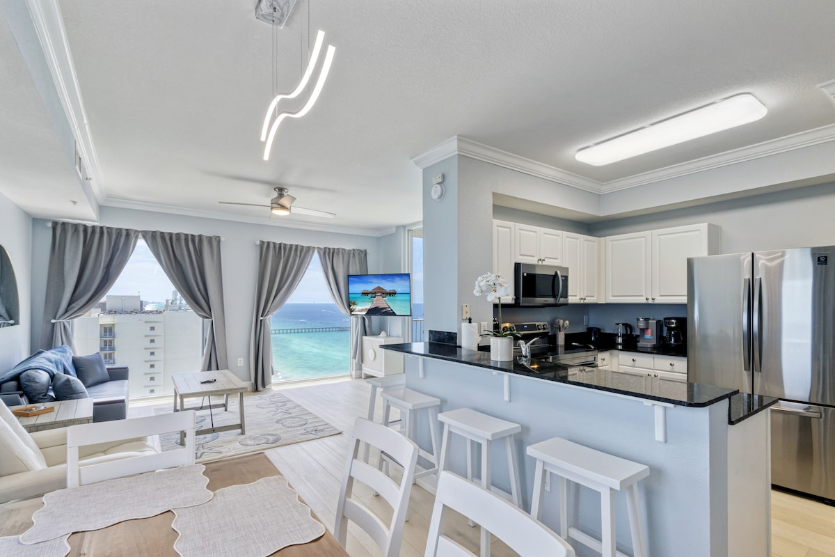 This 270-degree Observatory corner condo on the 25th floor offers breathtaking coastal beache views for miles. Located in the tallest building in PCB, Tidewater Beach Resort, this unique unit allows you to enjoy beautiful sunsets from right from the living room sofa or dinner table. At night, you'll be treated to the dazzling city lights on one side and the enchanting starlight and moonlight over the ocean on the other. The resort boasts several pools, a free spa, a gym, and private beach access