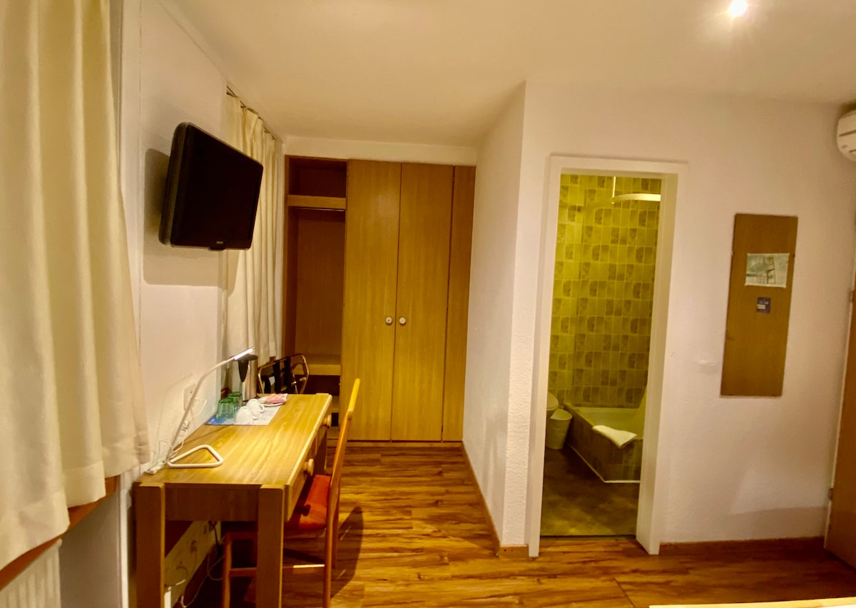 The room is located in the pedestrianized centre of Interlaken next to the famous Hoehematte park. Free WiFi is available. A private bathroom and come with a flat-screen TV, as well as tea-making facilities. Free toiletries are provided. Boutiques, banks, and the casino can be found in the immediate vicinity. The West and East train stations and the port can be reached on foot within 5 to 15 minutes. This is a hotel room.