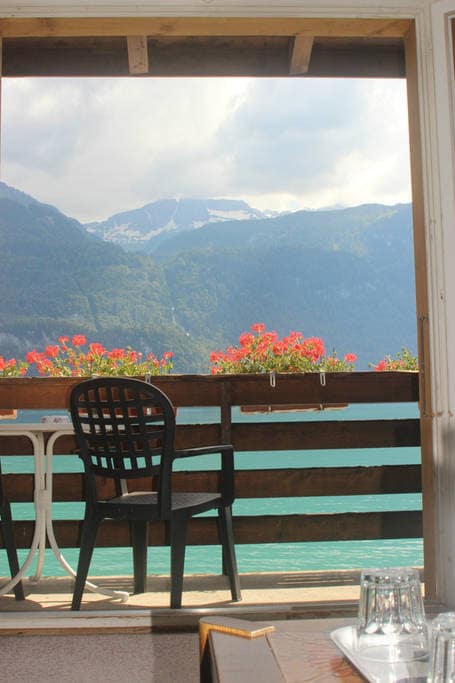 We do have three apartments with unique view over the lake of Brienz. An apartment consists of two double rooms, a living room and one bath. One double room is on the lake side, the other one faces the street side. Please note that there is no kitchen or other possibility to prepare food.