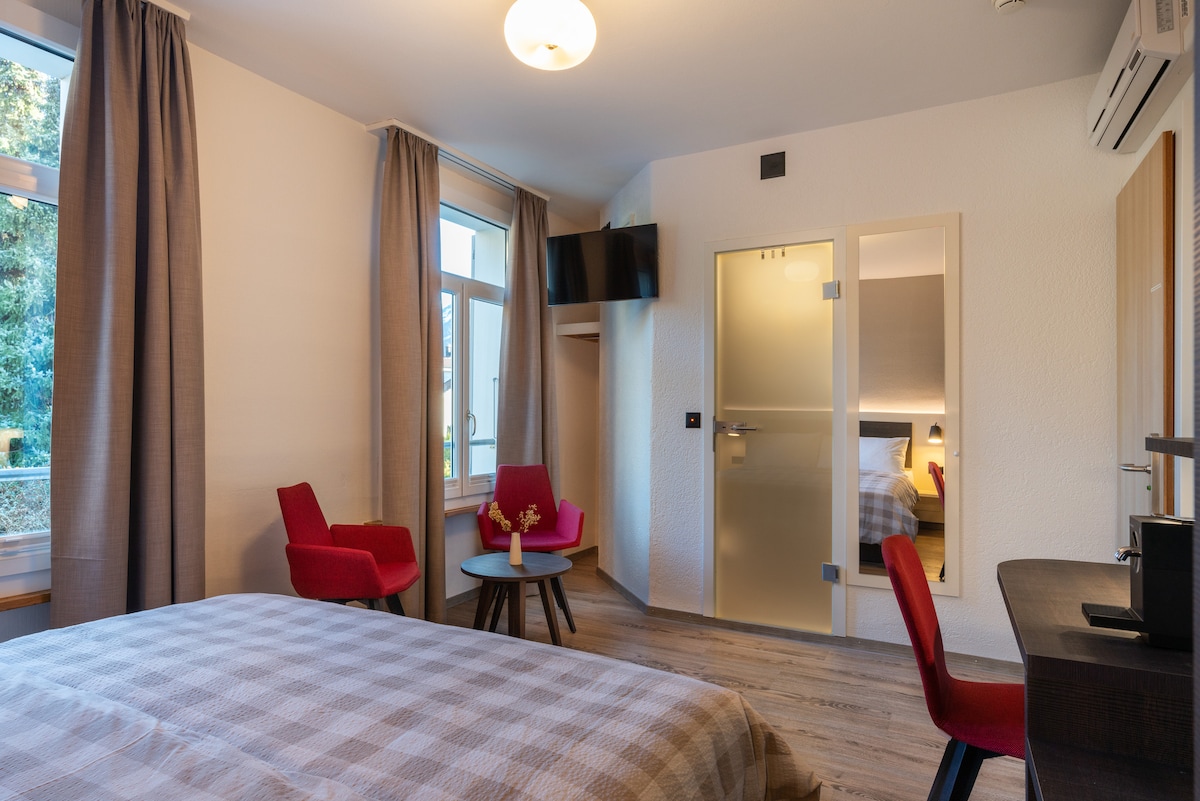 Quiet floor, Breakfast included. Dinner available upon advance order and at an additional cost. Comfortable, modern double room without balcony, but with a wonderful lake view from the window. With private modern bathroom with shower/WC. Ideally located for reading, lingering or active recreation. Quiet area: Our hotel is a retreat hotel that focuses on guests seeking peace and quiet. As we place great importance on a quiet atmosphere, our accommodation is not suitable for children.