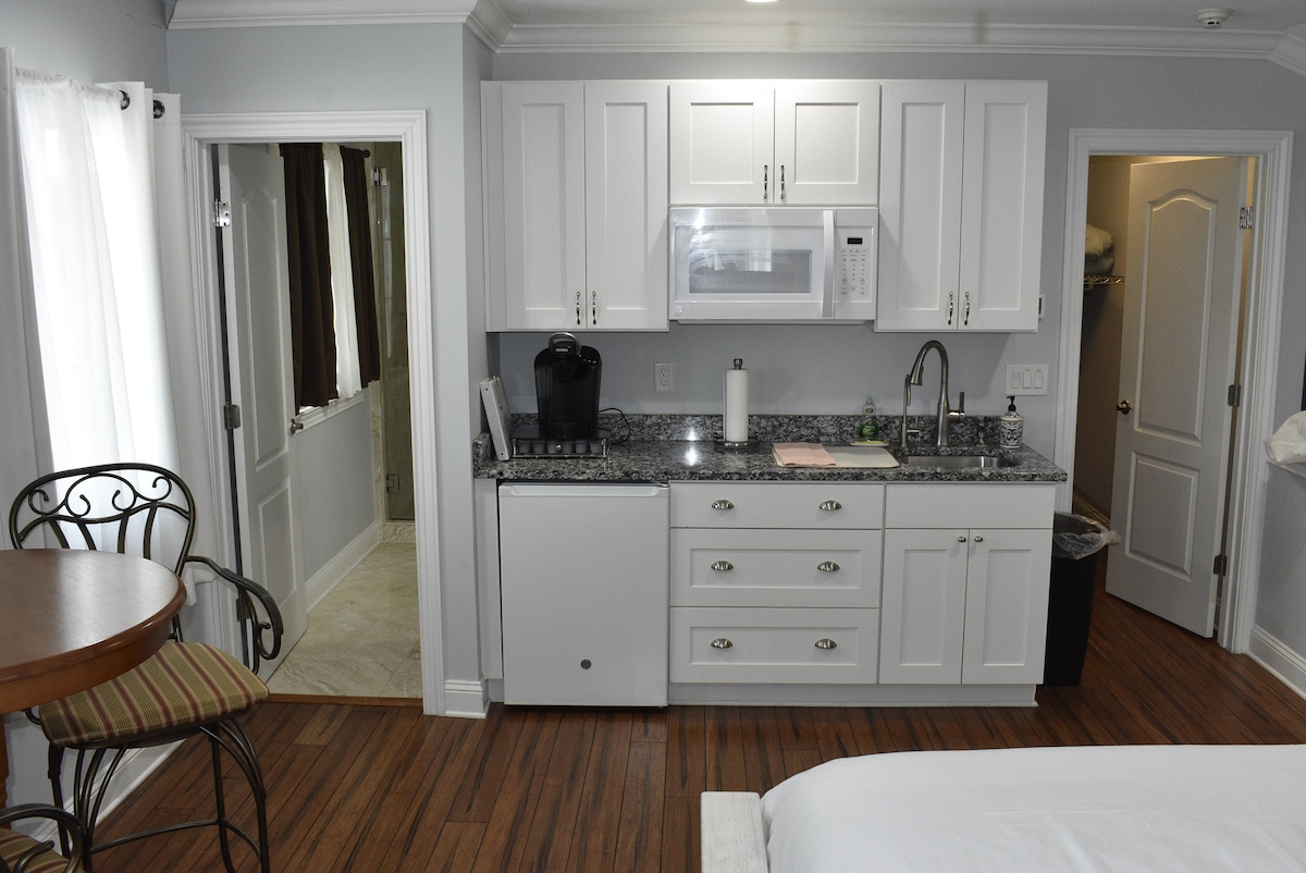 This cute space is attached to our home yet has complete privacy. there is one bedroom with one queen size bed The living area has a dual reclining sofa and chair so comfy to watch tv or sit by the fireplace on chilly nights. The main living space also has a table and chairs to enjoy meals or use as workspace. kitchenette with Keurig coffee maker , coffee , microwave, toaster oven, and mini-fridge. There is a cooktop in the apartment. Great location only 6 blocks from the beach.1