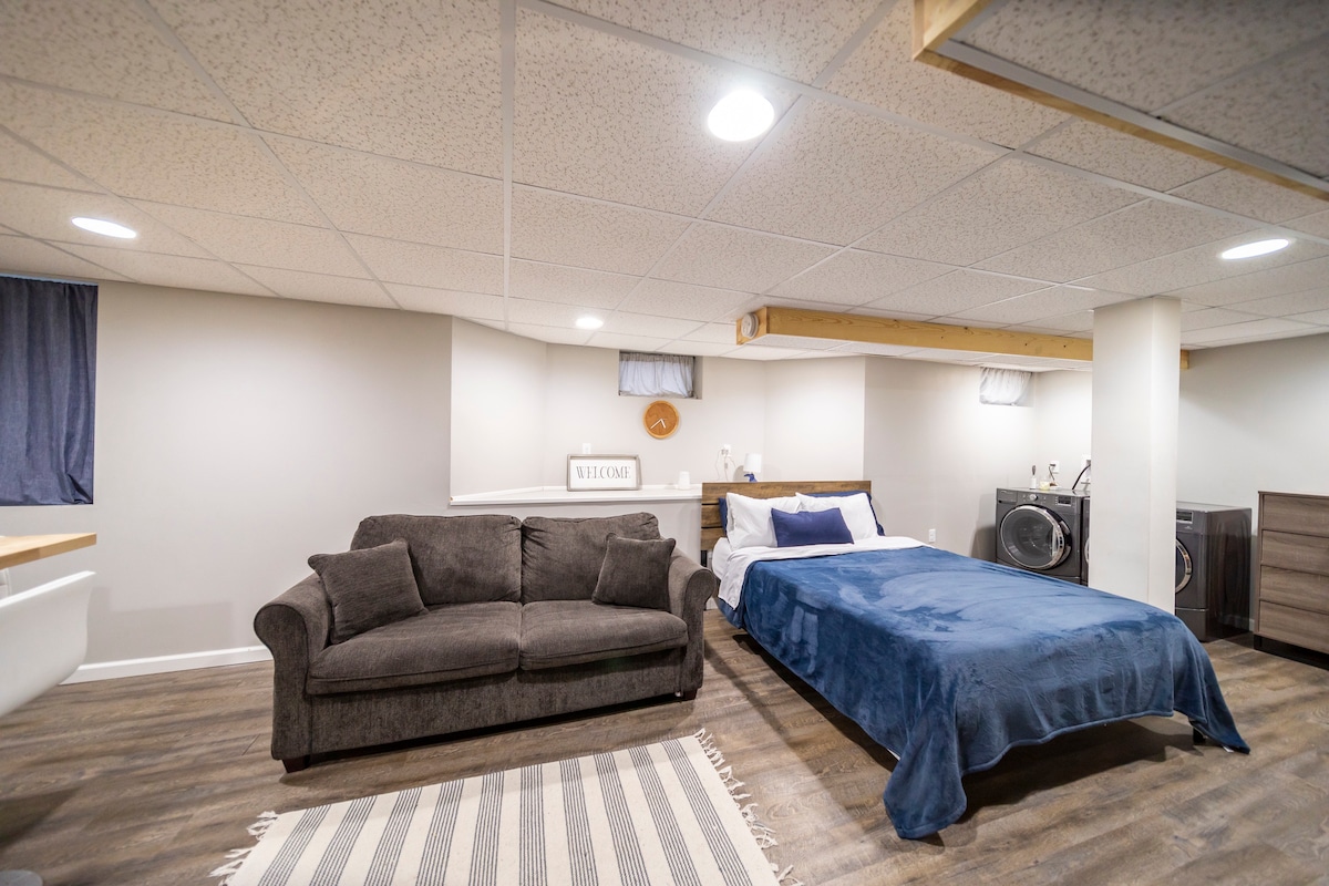 Enjoy a peaceful stay in our private basement suite. You'll love the tall ceilings, natural light, and watching wildlife in our backyard! Private entrance from the back patio, & off-street parking for 1 car. Includes: 1 bedroom with queen bed, bathroom with shower/tub, full kitchen, living room with futon couch, floor mattress, and pack 'n play. Ask for pet policy before booking. If interested in a blocked date, message me (new job=less weekly availability). 10% discount for educators 🏫❤️.