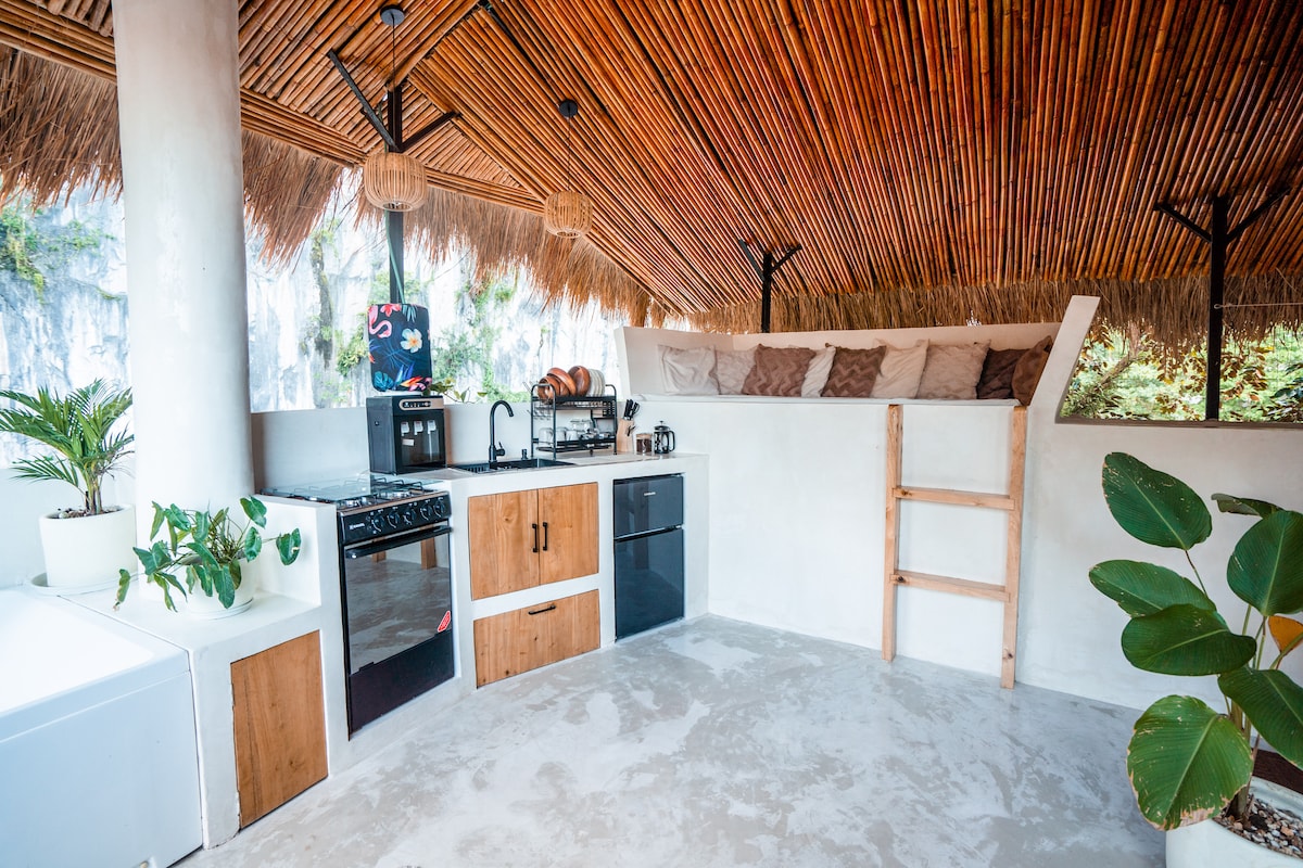 Sun-filled private home w/ private yard, lush, tropical setting • FREE transfers • 2 brand-new scooters • Sleeps up to 4 guests • Fully equipped kitchen • close to Vanilla beach Includes: ✨2 motorbikes 125cc, 4 helmets ✨Free pick-up & drop-off El Nido town & airport ✨Kitchen, dining area & grill ✨Distilled drinking water ✨Bathroom with hot shower ✨2 loft sleeping areas: 1 queen bed + 2 twin beds ✨Wi-Fi & Smart TV ✨Air-conditioning ✨Towels & toiletries ✨Lush garden lounge ☀️Solar-powered home☀️