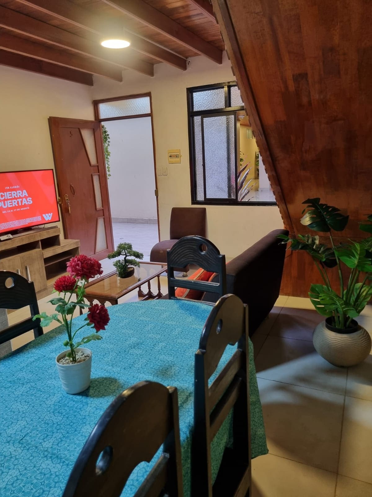 Relax in this brand new apartment; cozy and modern design on a second floor. Apartment located 5 minutes from the mall plaza, 10 minutes from the airport and 15 minutes from downtown, you can enjoy the tranquility and security of the condominium with common areas; delight in the singing of birds in the mornings, 24-hour surveillance, you can enjoy Iquitos with comfort and tranquility. The apartment is fully equipped, 24-hour water, 58-inch TV, exclusive utensils in the beautiful kitchen.