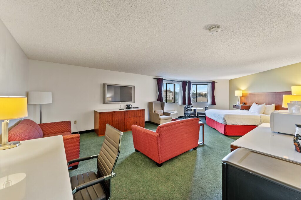 After a busy day of traveling, unwind in style in our generously appointed two queen room. With modern comforts and premium amenities including two luxurious euro top queen mattresses, a 50 inch LCD TV, complimentary high-speed wireless internet, in-room coffee maker, refrigerator, and microwave. Each morning you will enjoy our complimentary Breakfast.