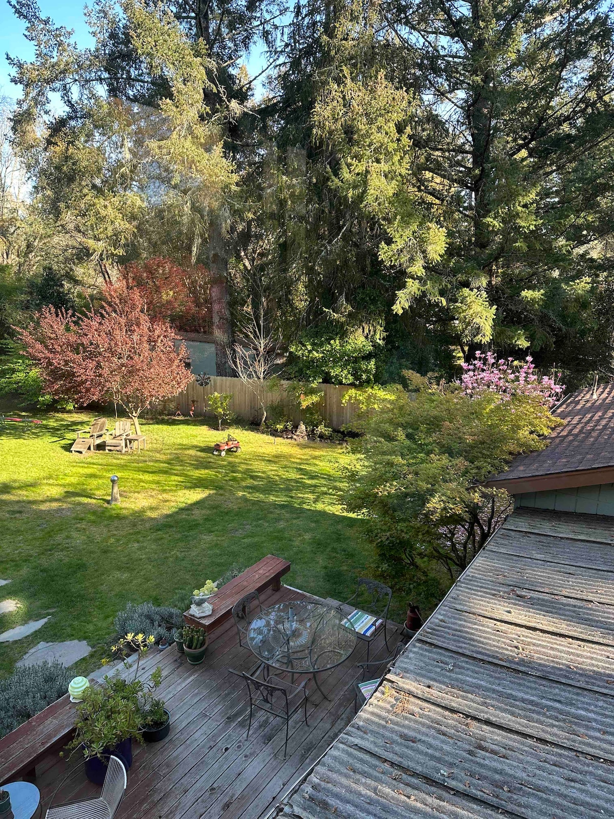 A private entrance leads to spacious, sunny room overlooking charming gardens. Room has a NEW QUEEN BED plus a nook nestled in the trees. Complete bathroom, closets, TV, mini-fridge and a library. The house is blocks from The Farmhouse Inn, multiple wineries, a scenic bike and walking path which is entered by our local park. We are also blocks from the Russian River.
