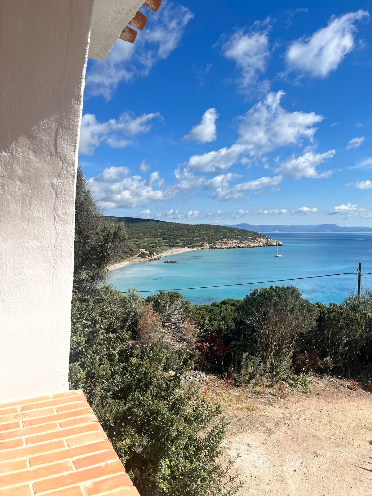 A stone's throw from the beach of Porto Pino, immersed in the Aleppo Pines of Sardinia, we rent an independent villa 30 meters from the sea accessible via a private staircase. Access to the beach at 300m IUN: P5466 CIN: IT111070C2000P5466 The house: Living area with veranda overlooking the sea, kitchen, double bedroom, second bedroom, bathroom, second BBQ veranda, private parking and garden (400 mq), outdoor shower. WI-FI, bed linen and towels included