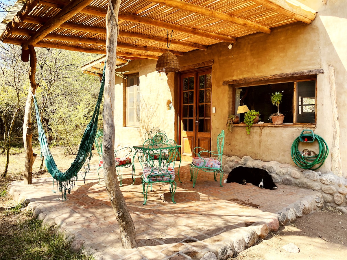 Relax in this unique and quiet place to stay. Natural construction house, made with a lot of love, materials reused and noble. Super spacious, fresh and cozy, ideal for spending a few days in the mountains to disconnect and connect with nature. Located in a quiet neighborhood, surrounded by trees and birds. 6 km from the wonderful Rio Quilpo, 3 km from the village square.