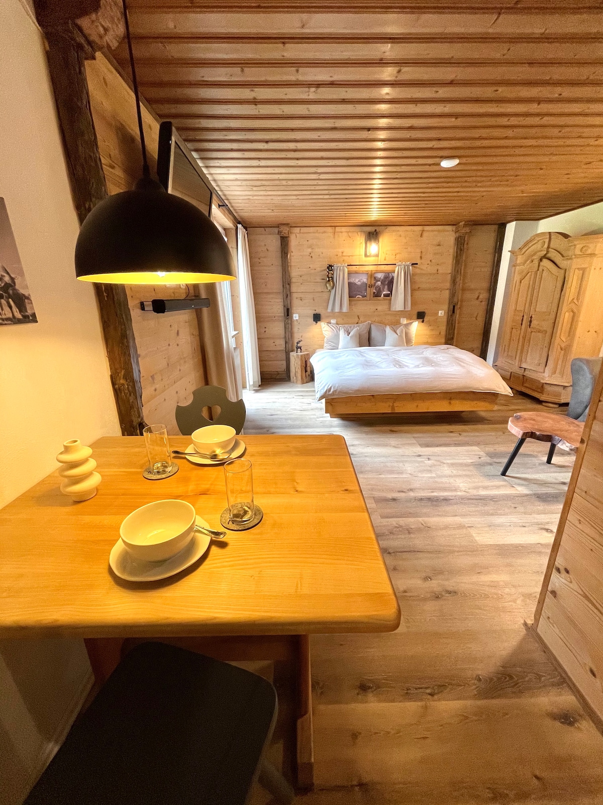 Nestled amidst the breathtaking mountain scenery of the Allgäu region, in the picturesque, winding village of Hinterstein, lies a charming and cozy one-room holiday apartment in a traditional Alpine house. Reclaimed wood elements, furs, slate, branches, and floral arrangements come together here, and no detail has been overlooked with loving attention to detail ♥.