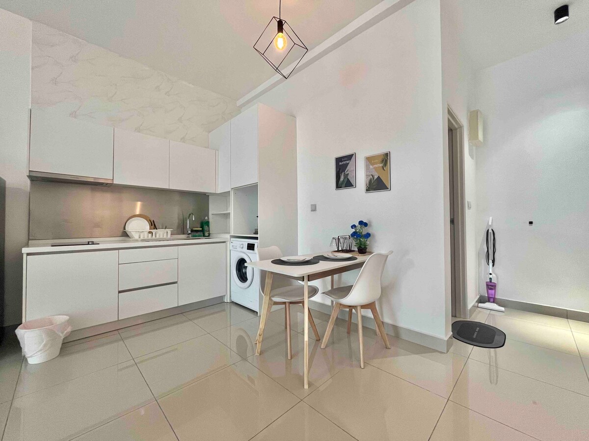 (1+1 BR & 1 bathroom) Contemporary modern and cozy condo in the heart of JB city centre. Suitable for 4pax family, friends and business group. **5mins to CIQ, City Square, KSL, Pelangi, and Larkin **8mins to Mid Valley Southkey, Larkin Sentral and Sentosa **15 mins drive to Paradigm mall, Sutera, Skudai and Mount Austin ✔ 4K SmartTV ✔ High Speed Wi-Fi, working tables with extension plug ✔ Washer ✔ Airconds in every rooms. ✔ Atari console, Mahjong, and Board games. ✔ FREE parking for 1 car