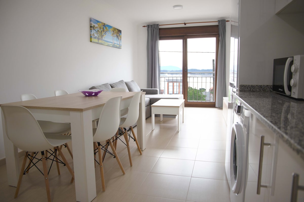 APT1A Apartment with ocean views, walking distance to the beach and the marina, perfect for visiting the entire Ría de Arousa and other nearby towns of special tourist interest, we are less than 1 hour from Santiago de Compostela. The bus stop is a 5-minute walk away and the frequency is hourly. There are supermarkets, shops and bars nearby. There's a city bus, too. It is delivered fully equipped with bed linen, towels and kitchenware. Located in a safe and quiet area.