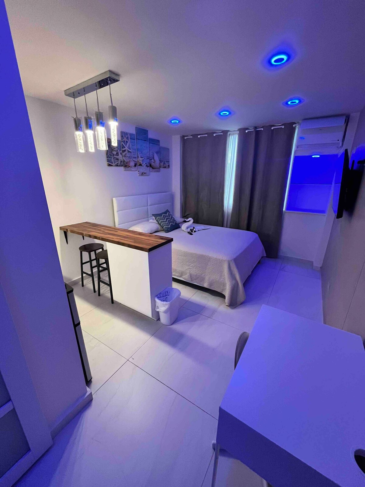 Lovely Designer beach loft apt. Located in one of the most popular beaches in PR. El alambique is a preferred beach spot for people of all ages. We are located walking distance to the best hotels and restaurants in the isla verde area. We offer one assigned parking spot-and the building has private security 24/7. Across from the building we have a small shopping area with different restaurants and convince store. Has one bed for 2 adults & a convinient air matres Full size for a child if needed.