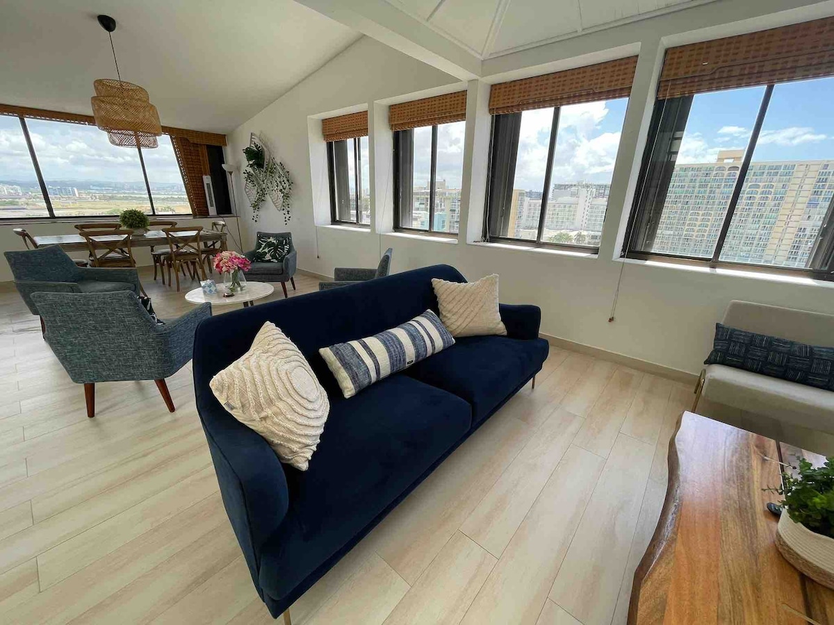 Bright, modern penthouse just half a block from Isla Verde Beach, with ocean, city, and lagoon views. Fully remodeled with complete furnishings, stocked kitchen, washer/dryer, WiFi, and private parking. Enjoy a rooftop terrace with 360° views, plus beach chairs, coolers, and access to the building pool. In a quiet area near restaurants, bars, and shops, and only 5 minutes from the airport. Uber or car rental optional, includes 1 private parking spot.