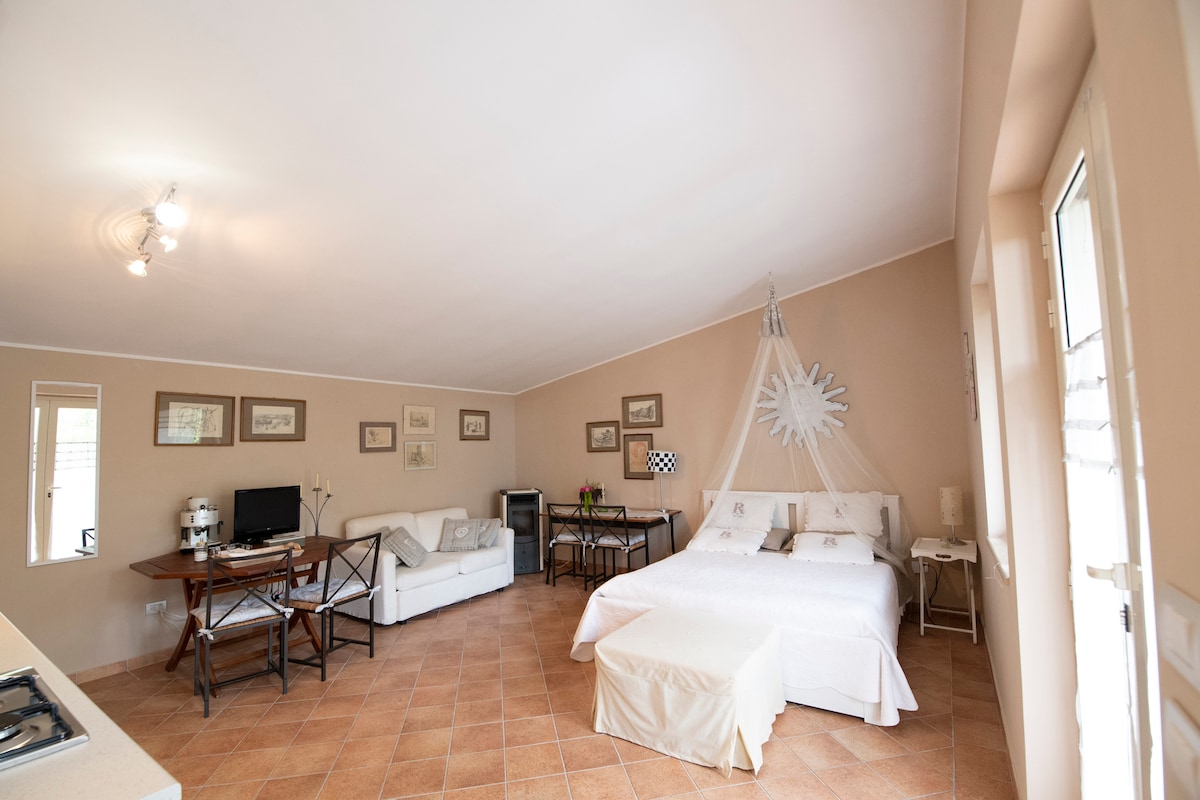 Bright two-room apartment with a romantic panoramic terrace to enjoy breakfast in the sun, an aperitif watching the flight of swallows and dinner under the stars. The house is located on the second floor (no elevator) of an ancient building with a characteristic courtyard in the historic center in a quiet location, but close to all services. It has a bedroom, bathroom with shower, living room with Smart-TV, sofa bed and kitchenette.