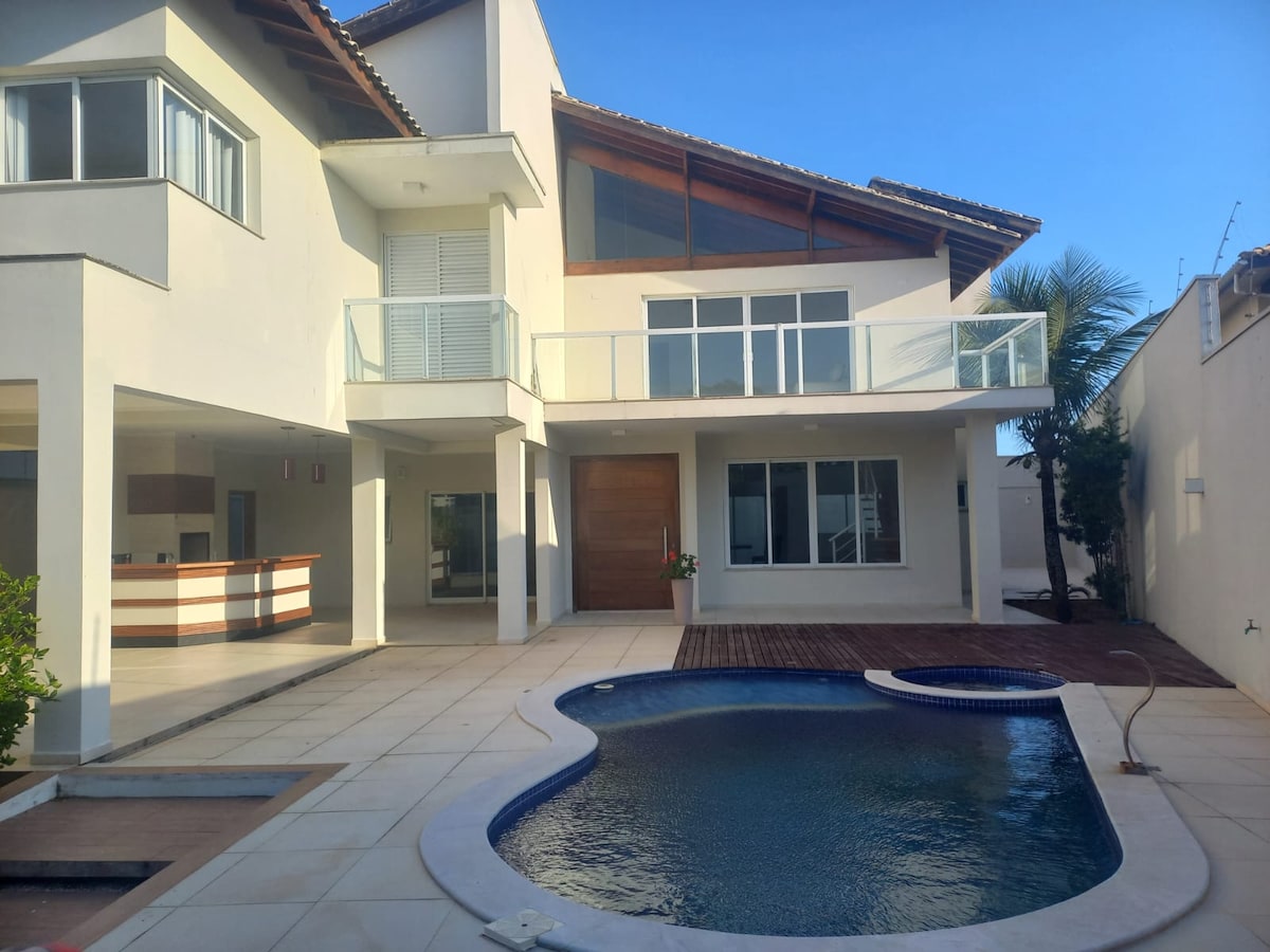Cozy house with differentiated and welcoming lighting. Heated Hydromassage SPA 7 seats with chromotherapy. Swimming pool 6x3 shallow side 80cm and deep side 140cm integrated with barbecue and balcony. Heated Pool: Apr to Sep 32° to 35° | Oct to Mar 28° to 30° 3 bedrooms with double beds in all of them, sleeping 10 people. American kitchen fully equipped and integrated into the living room. Fiber optic Wi-Fi Internet with great speed, SmartTV. Billiards, 4 spaces, just 500m from the sea.