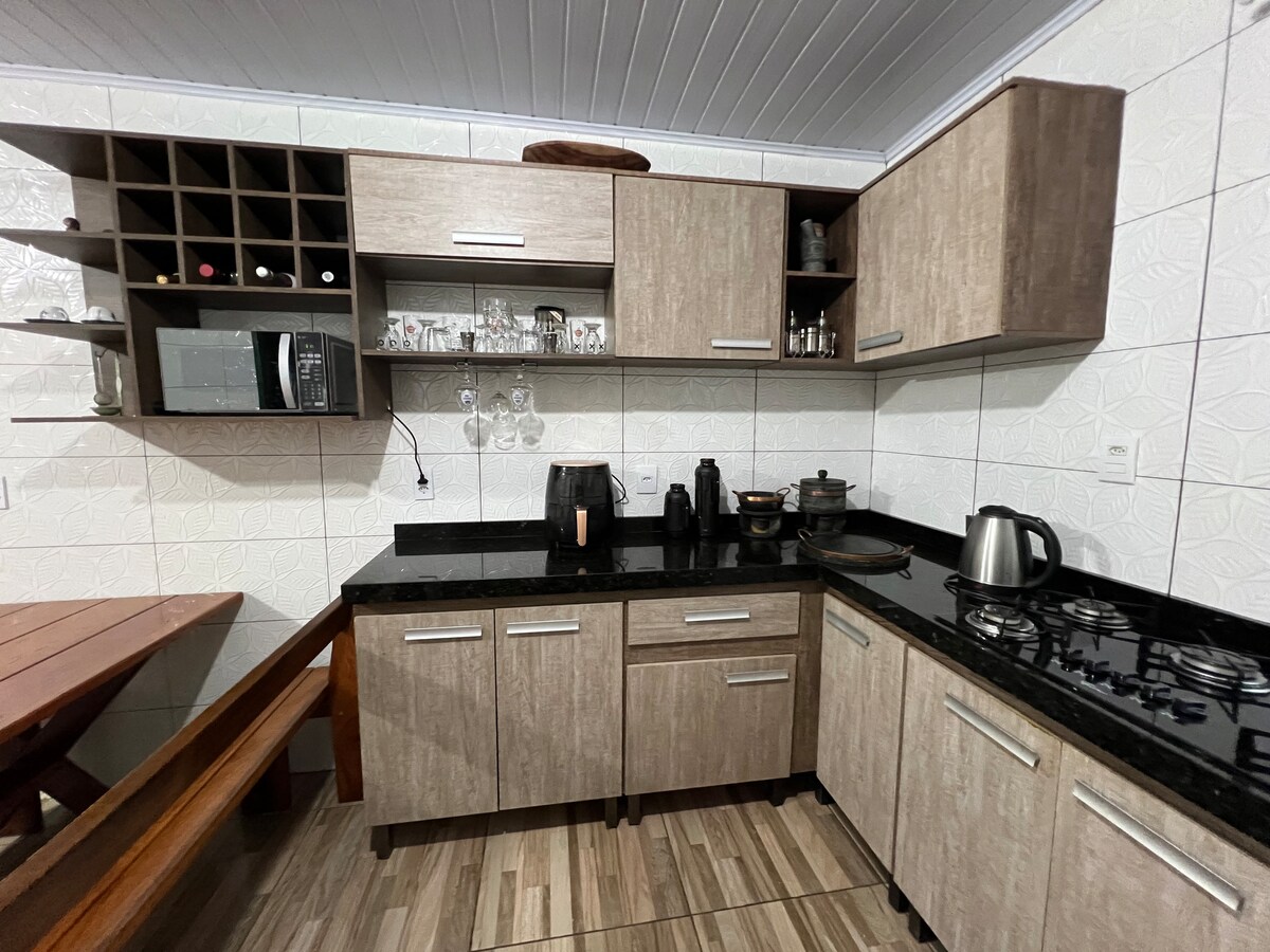Experience magical days in the midst of nature! Cozy chalet and charming space, perfect for resting and reconnecting. Close to the Garapiá and Forqueta Waterfalls. It has a living room with a sofa bed, TV, fireplace, books and games. On the mezzanine, a double bed and a single bed. Kitchen equipped with essential utensils for a pleasant experience. Ideal for couples and families looking for tranquility and good energy! 🐾 Friendly animals are welcome! We will be happy to welcome you and your family! 🌿✨