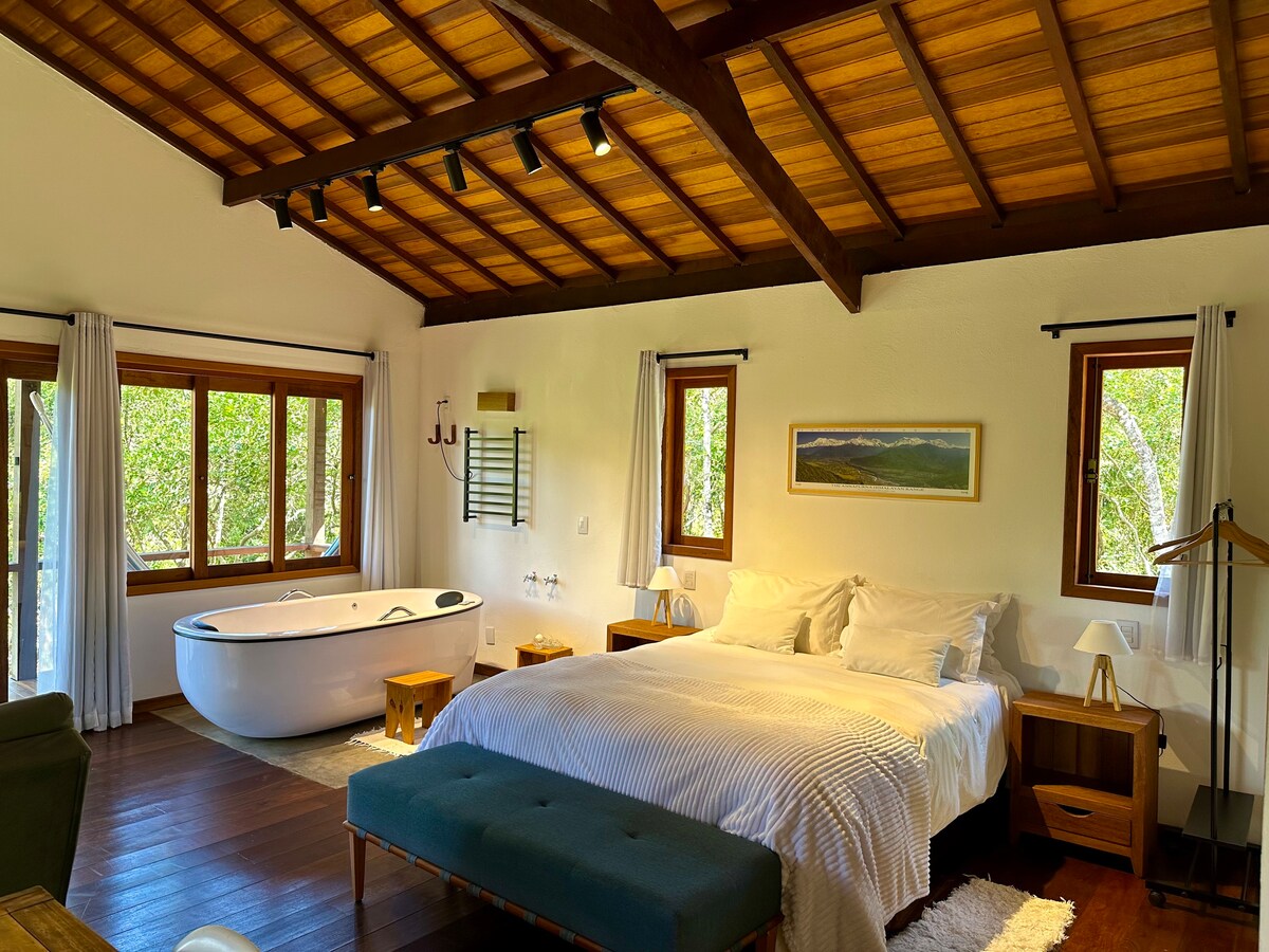 - Hummingbird Master Cottage of 70 square meters, super comfortable with two rooms, King Size Bed, Ofuro, fireplace, minibar, bathroom with shower, 43-inch 4k TV (cable TV with HD channels), Wi-Fi, living room, hot and cold air-conditioning, separate toilet - Mini kitchen, dining table, coffee maker, microwave and complete kitchen utensils and a beautiful balcony overlooking the river. Note: Children up to 5 years old stay free. Children 6-12 years old are charged 20% of the daily rate.
