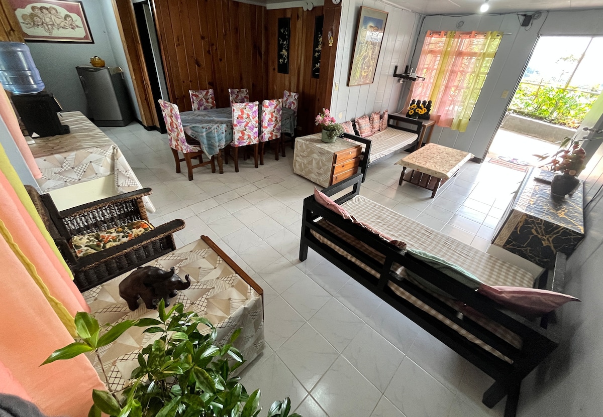 Enjoy mountain views and crisp fresh air in this cozy, stylish and charming home 10 minutes from restaurants and attractions such as Camp John Hay, Mines View Park, The Mansion House and others. Perfect for families and groups of friends, this pet-friendly and wheelchair-accessible home offers an indoor fireplace, 2 outdoor fire pits, 4 bedrooms with bathrooms, a full kitchen, alfresco dining, front and back yards; cableTV, karaoke machine, & fast internet for those who wish to work from home.