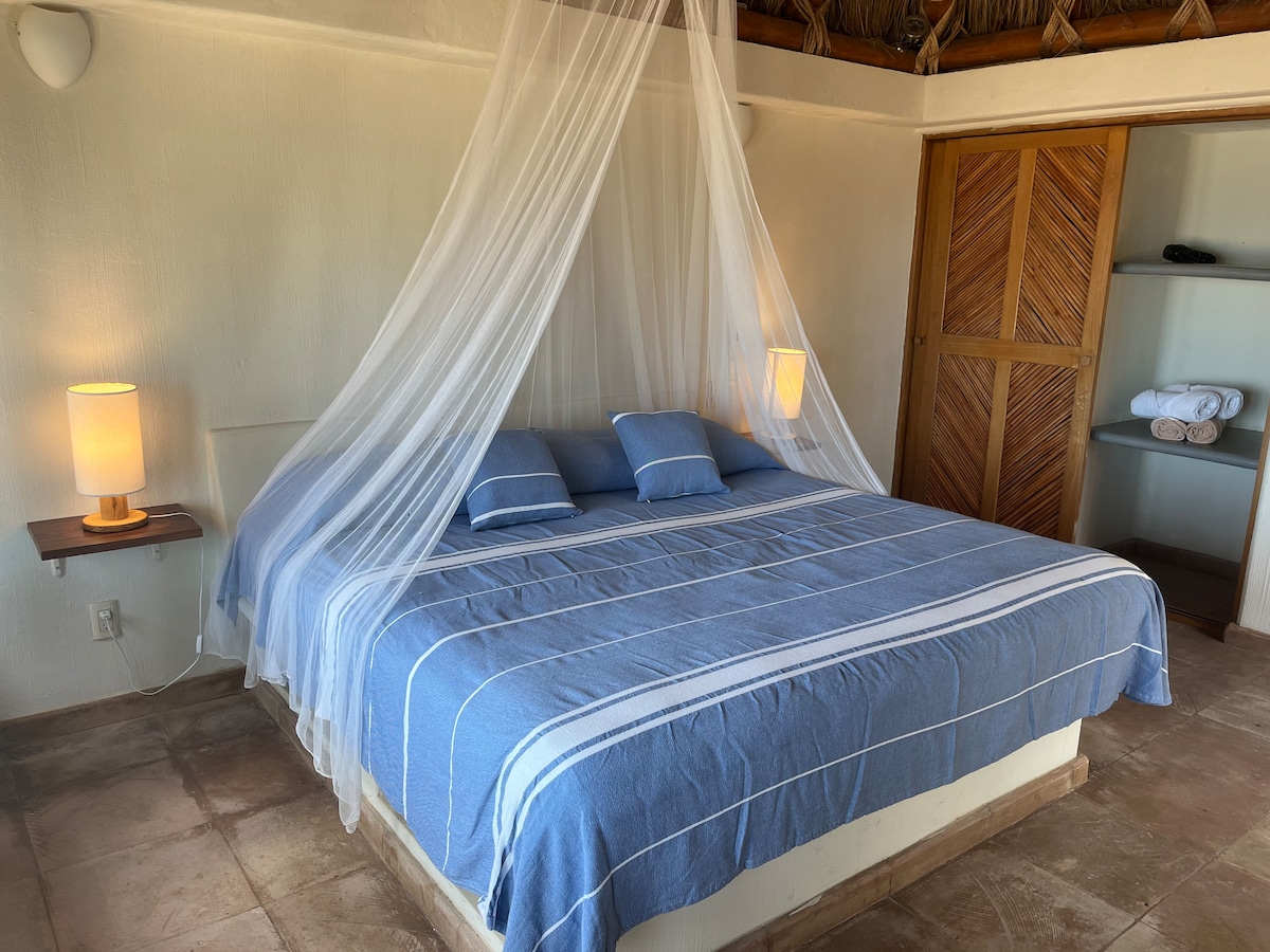 RUSTIC OPEN AIR PALAPA loft; unbeatable views; No AC or screens; tropical jungle. 2 min walk to wide tranquil beach. Beach chairs/umbrella, Wifi, maid, safe, shared jacuzzi dipping pool, security cameras, LR, bar, kitchenette, bath/shower, 2nd upper loft, resident cats. Queen bedroom. Mosquito net, fans, ocean breeze, bug spray. 6 min. walk beach or street to restaurants. If sensitive to insects consider Calabaza's Africa Suite with AC, screens and doors..