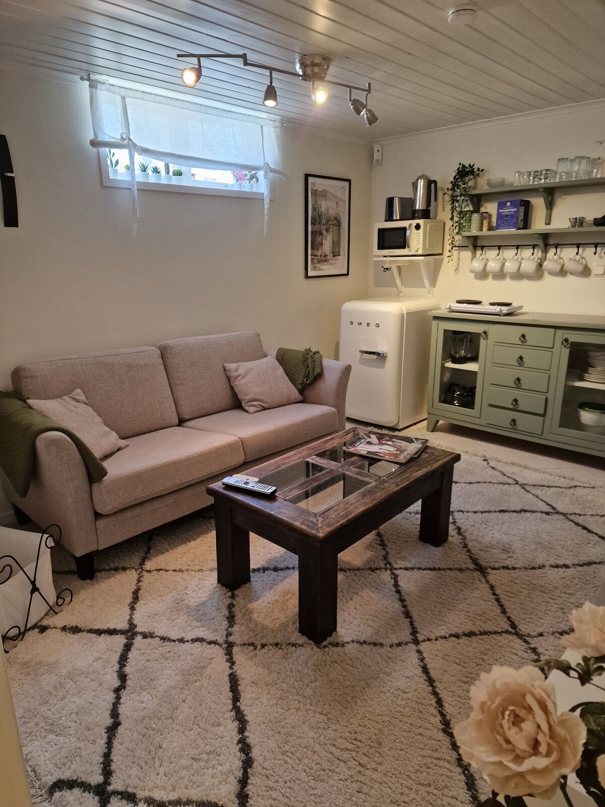 Brand new apartment in the villa! Sleeps 2 adults, and one child. Large bathroom of 10 sqm, with sauna, bathtub, shower, toilet and sink. Room of about 20 sqm with a double bed. All sheets and towels are included in the price. A sofa group and kitchenette are included. You'll get a code for the door from the host on the day of arrival. You can check in as late as you want. Electric car charging box is also available at a cost per kilowatt hour. Most of the lighting is dimmable. A patio on a covered porch is available.