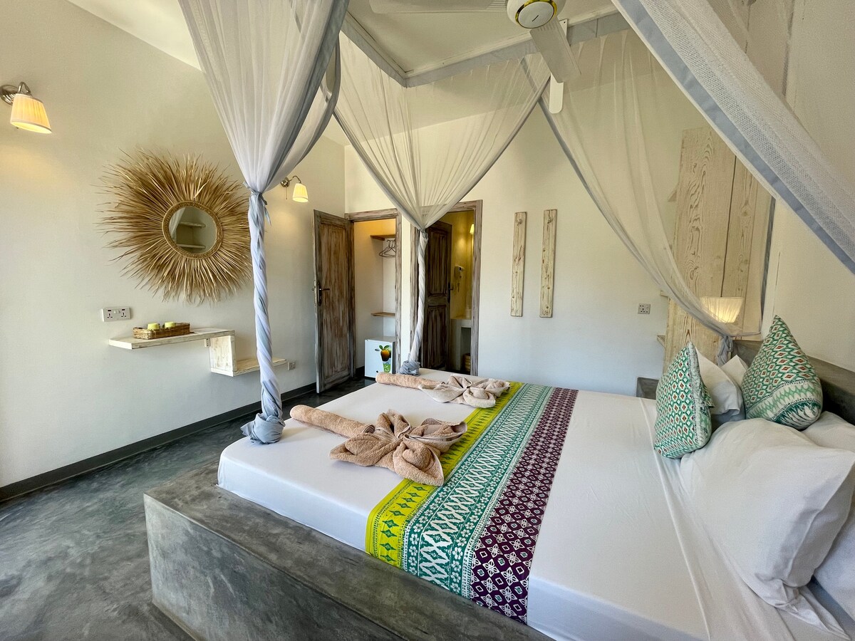 1 en-suite stylish bedroom on second line of the beautiful Jambiani Beach, with private entrance, in a building with 4 rooms, 2 big kitchen for sharing, 1 min walking to the beach, pool and private beach next door, lots of restaurants and activities around.