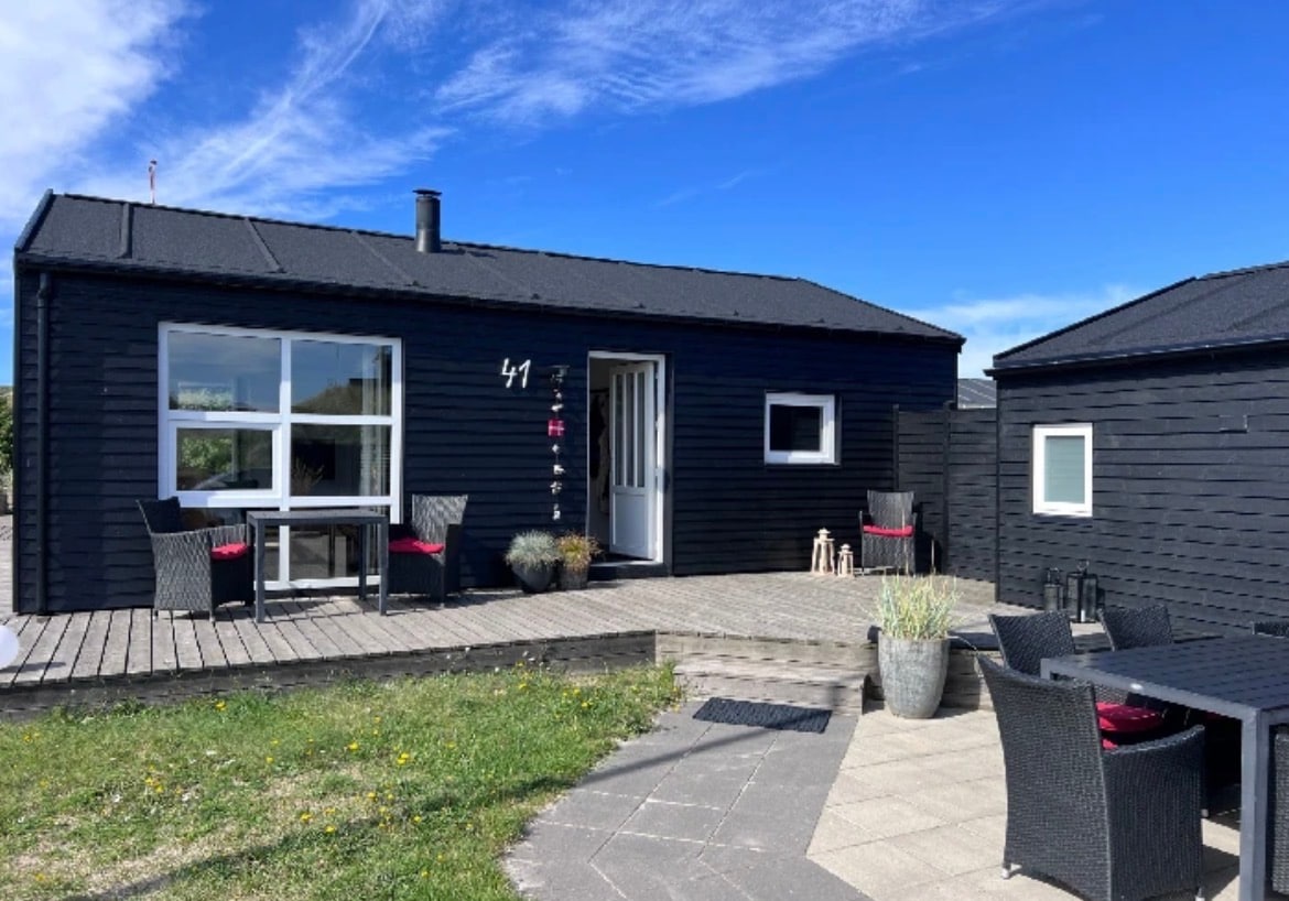 Relax with the whole family in this cozy and modern home just 400 meters from the North Sea at Grønhøj Strand. Our lovely cottage has a unique combination of a beautiful natural plot and a charming house that invites coziness and comfort. The house has two nice rooms with two beds in each. The kitchen and the living room are the heart of the cottage. Outside, a closed terrace awaits, where there is room for barbecue, sunbathing or a campfire. Next, there are outdoor showers with cold and hot water.