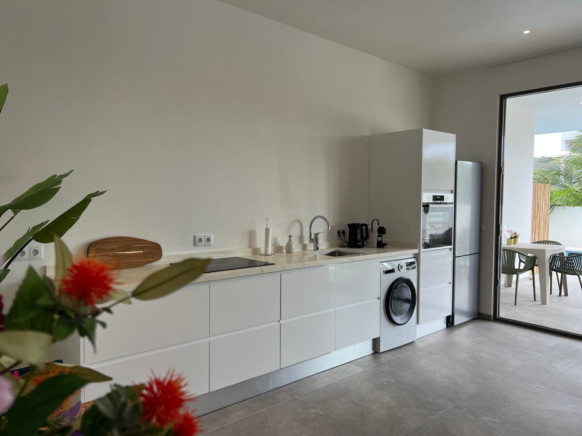 Spacious modern apartment in prime location, enjoy the short 7 minute walk to the beautiful beach, bars and restaurants. The apartment is totally private with your own entrance, living room, bathroom, bed room with AC, kitchen and outside area. The apartment is equipped with a new comfortable bed and a luxurious (sleeper) sofa. The outside area and garden invite you to sit, take a swim or have a glass of wine whilst watching your favorite Netflix series on the Smart TV in the living room.