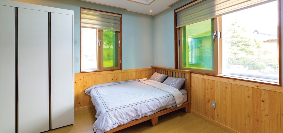 Experience the view of Hanok from the window. You can feel your mind calm and quiet. The interior is 32 pyeong, the exterior is 100 pyeong including a front yard with grass and a 5-square-foot garden. You can use the entire hanok. < Instructions for Guests > - Please keep the room clean during the period of use, and organize the room supplies and separate the garbage when moving out. - No bringing hazardous materials indoors - Do not use any electric heaters other than those provided - Prohibition of acts that cause inconvenience or damage to others due to noise and loud noise - Prohibition of acts that cause discomfort or disgust to residents - No pets allowed -All rooms are non-smoking areas. - For a pleasant space, cooking oily foods such as frying, fish dishes, and meat indoors is prohibited. -For fire prevention, candles and personal cooking utensils are prohibited in the room. The barbecue is currently closed. We can lend you an electric grill if you want.