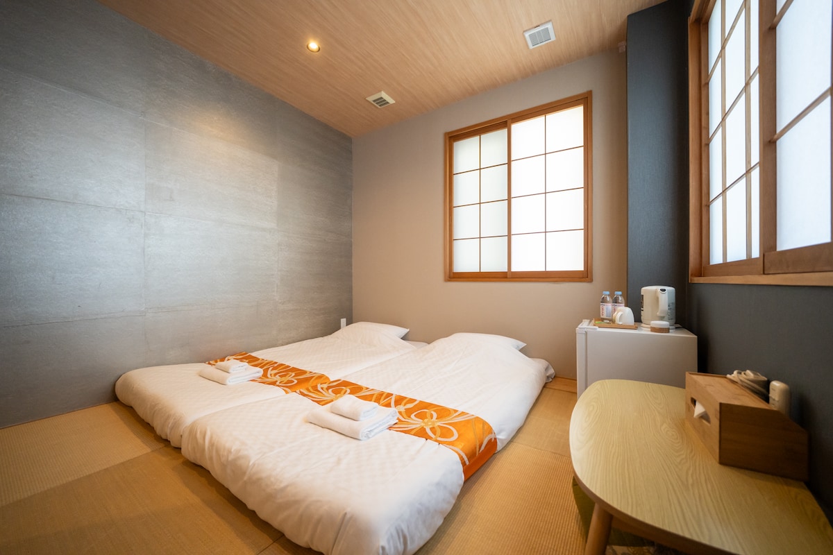 Long-term stays are welcome! Please contact us for further details. A modern Japanese boutique hotel that combines Japanese tradition and modern architecture, opened in December 2017 in Kawaramachi Gojo, Kyoto. There are 6 rooms in total, each with a different concept, using traditional Japanese materials such as washi paper, copper, tatami mats, wood, and stone, arranged in a modern style, and futons made with carefully selected clean and soft linen.
