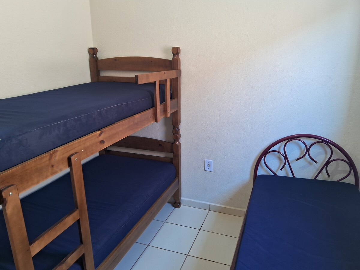 Acomoda 5 pessoas sendo 6 camas Sexto hóspede a combinar Quarto com ar condicionado e 2 beliches sendo 4 camas de solteiro. Sala c/ ventilador de teto com1sofá cama cozinha equipada ,outro quarto c/ 1 cama de casal e ventilador de teto banheiro c/ ventilador,garagem SEM COBERTURA vaga p/um carro. Roupas de cama completo. SEM TOALHAS DE BANHO Moro nos FUNDOS , sem contato com hóspedes. Garagem exclusiva dos hóspedes. O imóvel deve ser entregue sem lixo e comidas na geladeira.