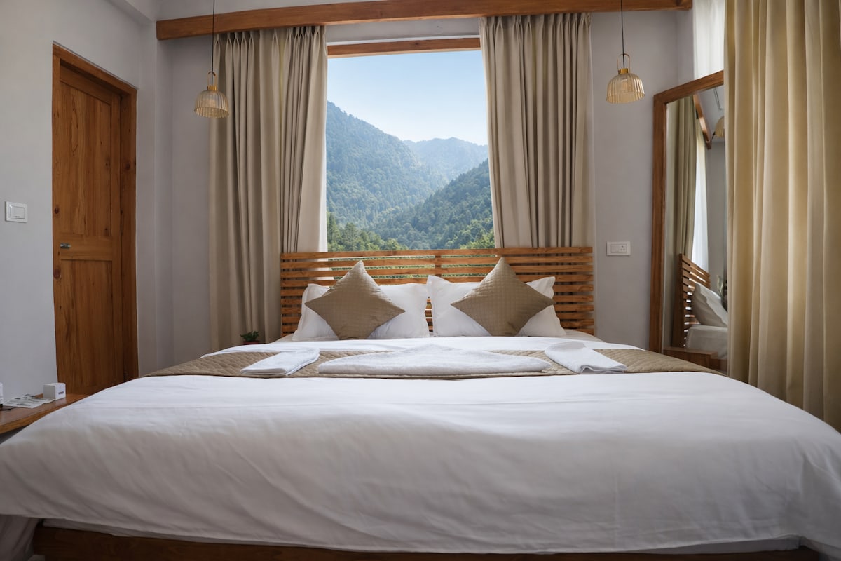 Enjoy a peaceful stay in this spacious room with stunning mountain views. The room features a comfortable king bed, cozy seating area, large windows with natural light, and a private balcony overlooking the valley and snow-capped mountains. Guests also have a modern attached bathroom with hot water, a workspace, and a TV for a relaxing stay. Perfect for couples, families, or travellers looking for a calm mountain getaway.