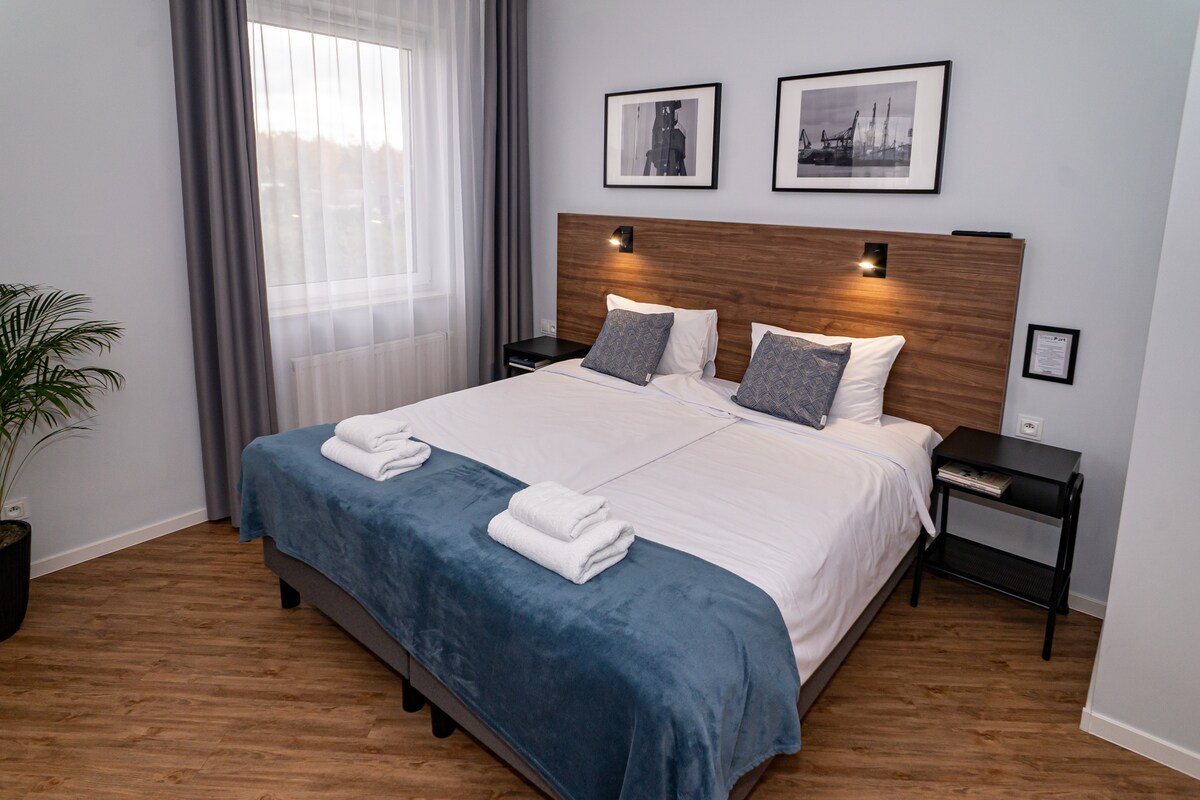 Room for two (BLUE) in Fusy Miętusy The room is a comfortable bedroom with two beds, a wardrobe, armchairs and a table. The bathroom has a functional large shower. Bed linen and towels are available. The room has access to wi-fi. The room has a view of the Gdańsk churches. The room is located above the Fusy Miętusy cafe where breakfast and lunch are served, and the bar is stocked with good local beers and world-class whiskey.