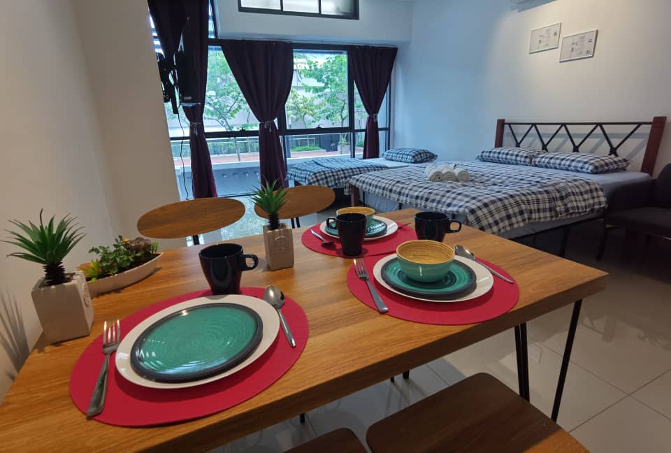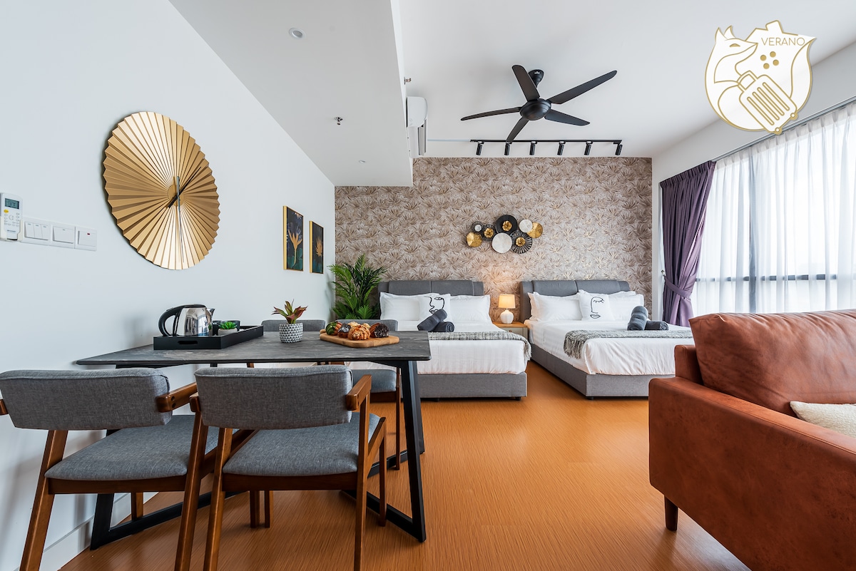 ☆Brand NEW Modern & Cozy Studio ♡♡ COMPLIMENTARY Instant Noodles Cups & Fresh Mint Candy♡♡ ☆Fully Furnished Studio ●42-inch smart TV with streaming services like Netflix ●Fully equipped kitchen with hood & hob ●2 doors fridge ●Queen size bed ●Lazy sofa ●Dining table & chairs ☆ Practicalities ●Free 1 parking lot and high-speed Wi-Fi, adding to the convenience for guests ☆Facilities ●Swimming Pool ●Swing Chair infront unit door step