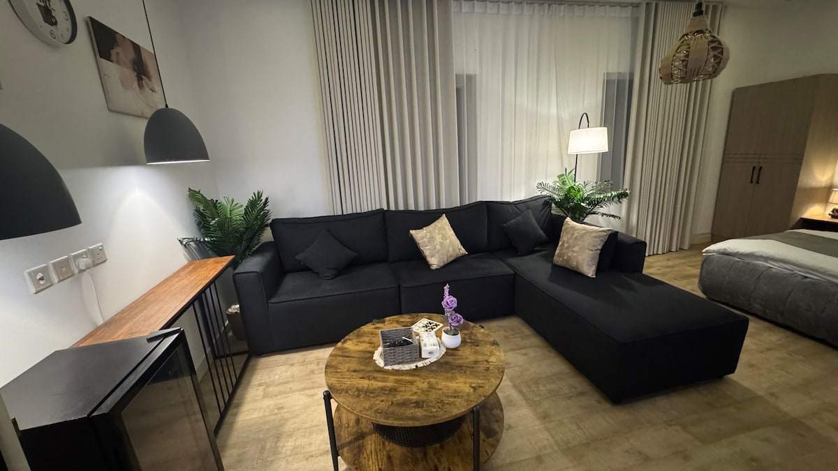 An elegant studio with self check-in, designed in comfortable colors, furnished with modern furniture. There is a 65-inch screen, Netflix and YouTube subscription, and it contains coffee, tea and water hospitality. It is equipped with all bathing tools. It is characterized by its wide space and complete privacy with smart check-in. It is close to Jazan University and the university sea. It is 8minutes away from the airport and 5 minutes away from the Boulevard and Al Rashed Mall. There are all services in the neighborhood, including restaurants, laundry, barber shop, cafes. For your information, it is a one-room apartment with only a bathroom Designed for your comfort. Have a nice stay.