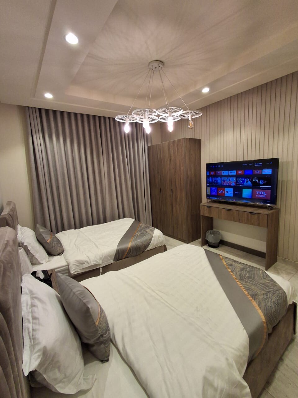 Experience luxury and tranquility at Lusso Suites elegant, high-end accommodations featuring smart entry and full smart home integration. This modern suite includes: • A master bedroom • A stylish living room • A fully equipped kitchen • A 75-inch smart TV with all major apps for your entertainment ✨ Prime location in the heart of Jeddah, overlooking Madinah Road, with upscale restaurants, cafés, and supermarkets just steps away 🚗 Private parking available