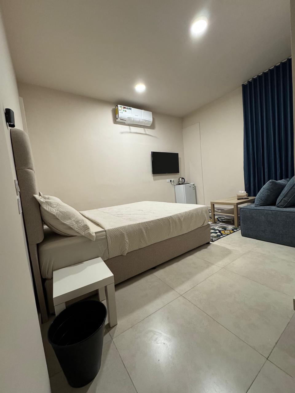 A modern studio with a refined design offering comfort and privacy, featuring smart self check-in. Includes a king-size bed, elegant seating, massage chair, full kitchen, and a luxurious bathroom with Jacuzzi. Hotel-style cleaning is available upon request. Smart use of space, stylish furniture and calming touches. Located 5 mins from Jeddah Airport. Fast Wi-Fi, 75” TV, free Netflix. Quiet building with elevator and private parking. Everything you need for a perfect stay.