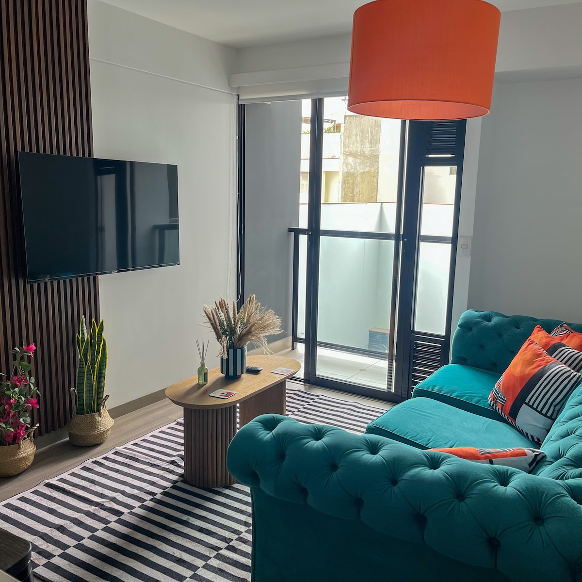 Moderno y acogedor departamento de una habitación, ubicado en zona estratégica de Barranco, límite con Miraflores, frente al MAC y a 5 min de Larcomar. Situado en el piso 9 con vista interna, cerca de museos, parques, bares y restaurantes. Ideal para parejas, viajes de trabajo o familias pequeñas. Equipado con TV en sala y dormitorio. Opcional: cochera y cuna corral. No está permitido fumar dentro del alojamiento.