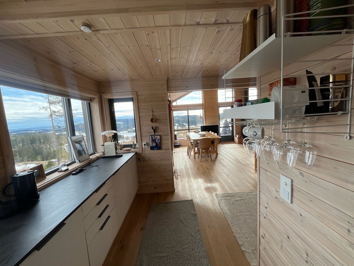Idyllic cottage. Here you will find peace with stunning views and sunsets as the cottage is located at over 600 m above sea level. The cabin is exclusively furnished and appears as new. 3 bedrooms with double beds. Daybed for reading and coziness. Sauna in its own "cabin" with space for 4 people. It's like a separate wellness area with toilet, shower and dressing room. You are sitting in the sauna with great views. Very good beds with exclusive mattresses from Jensen on all beds. Fully equipped kitchen with dishwasher. Washing machine and dryer.