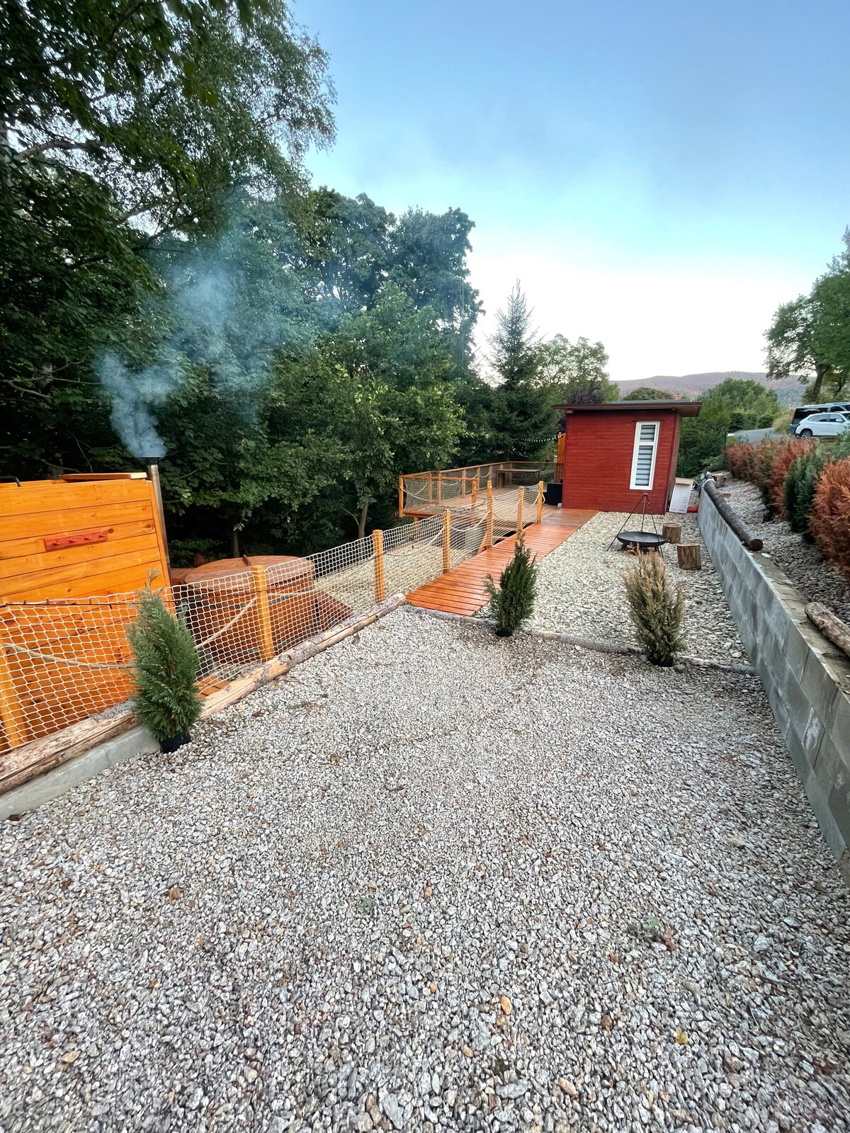 Treat yourself to a piece of peace. An unusual type of accommodation in the arms of nature with a spacious relaxation terrace, a couch, a relaxation net and a whirlpool hot tub. Here you can spend summer days and frosty nights. The cottage has a double bed (extra bed for a small child), a kitchenette, a wine shop with selected wines, an automatic pellet stove and a coffee table. Outside you can find a fireplace, a hot shower and a toilet. There are interesting excursion spots nearby. Parking is available at the resort