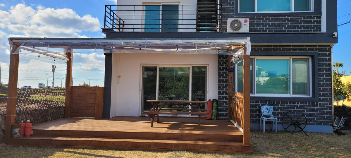 Located in the seaside village of Hamdeok, Jeju This is Hoyudong Stay, a private house with a stone wall. Take a break from the busy life So that you can fully relax in the quiet Jeju village This space is prepared with comfort and warmth. Hamdeok Beach, which you can meet in about 10 minutes on foot The quiet village atmosphere blends in You'll be satisfied with both travel and relaxation. When you enter the accommodation Sunny living room and cozy bedroom, A tidy kitchen and a comfortable lounge area are connected. In the outdoor space surrounded by stone walls There is a spacious lawn yard and a private open-air jacuzzi. You can comfortably relieve the fatigue of your trip with warm water. In the evening, with a fire Feel the quiet night of Jeju slowly. Family trips, trips with children, gatherings with friends, and even large family trips so you can stay comfortably with any companion We have carefully prepared the space and facilities. In a space where Jeju's sensibility and comfort coexist Rest your body and mind Enjoy a special trip to Jeju.