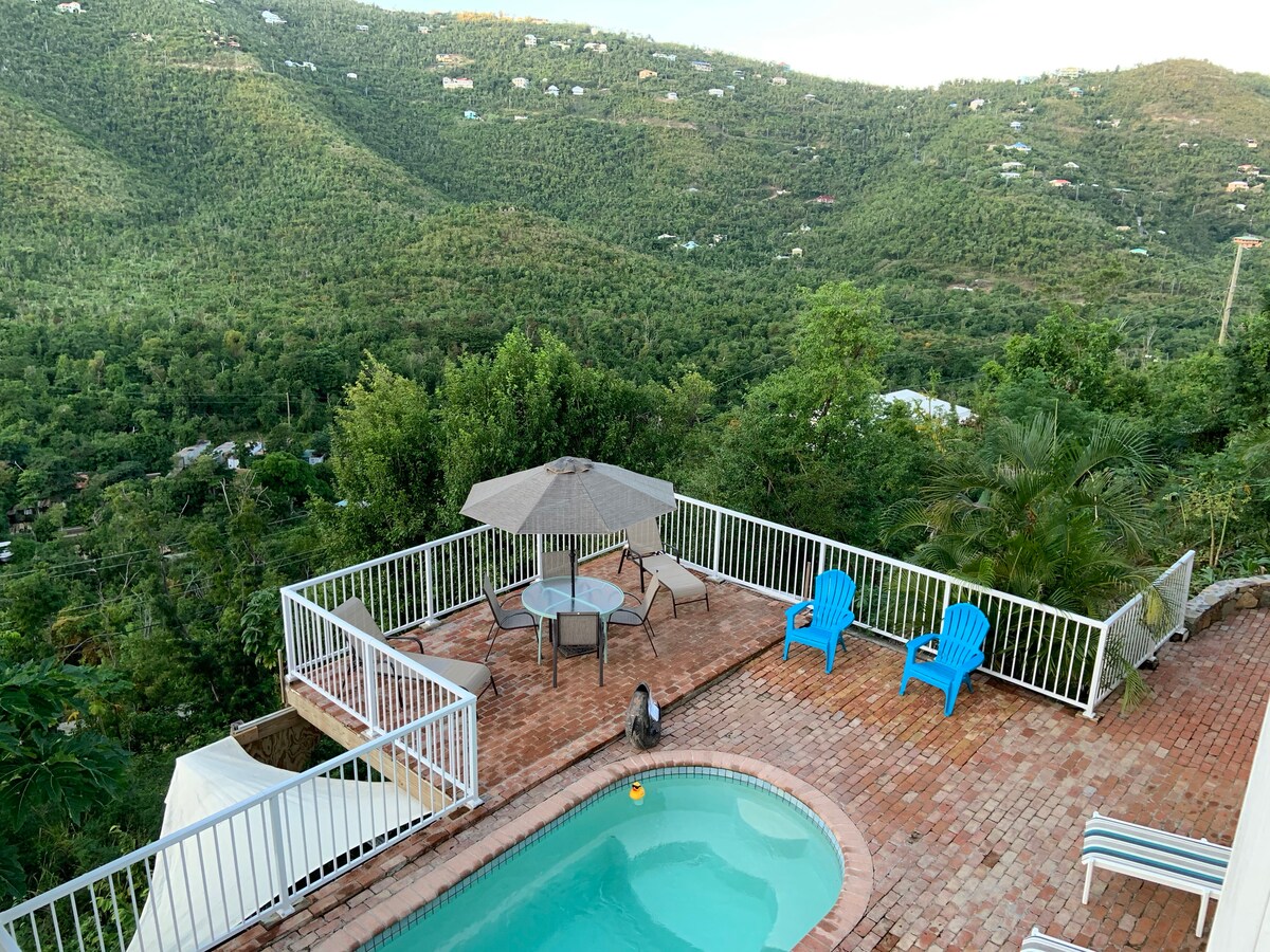 2 cozy bedrooms, fully equipped kitchen, large decks, pool, solar and backup battery power. Everything you need for a day at the beach: chairs, umbrella, coolers, toys, towels all provided. Close to Coral Bay restaurants and shops. North Shore beaches and hiking trails are only a short drive away. Quiet setting in the hills above Coral Bay. Close to it all with a far away feel. good for couples, solo adventurers, and families with children over the age of 8.