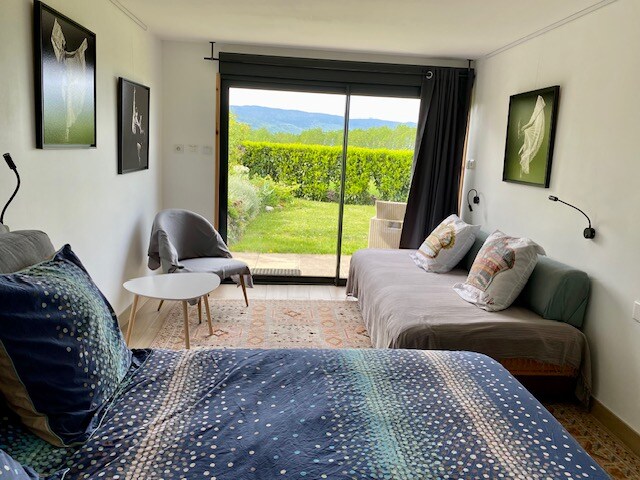 ● Brand new 45 m2 2-room apartment in small condominium Self ●check-in, very easy to access ● 1 free private parking space, if necessary possibility of having a 2nd ask me. ●1 double bed 160 and 1 sofa bed, the sofa bed house to accommodate 4 people max...... ●view of private garden quiet countryside● environment ●bathroom with bathtub dolce gusto coffee● machine ● if available, possibility to arrive before/leave later €8/hour, contact me before.