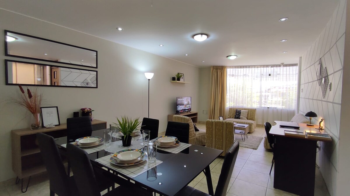 Disconnect from your worries in this spacious and bright space, where your stay will be pleasant and comfortable; a multi-family building with an excellent view, located in a safe, quiet residential area 10 minutes from the historic center and 25 minutes from the airport, close to supermarkets (TOTTUS and PLAZA VEA) small wineries (3 blocks) and to taste our delicious traditional food, the TIPIKA restaurant is very close, 5 blocks from the apartment as well as the SAMBAMBAIAS.