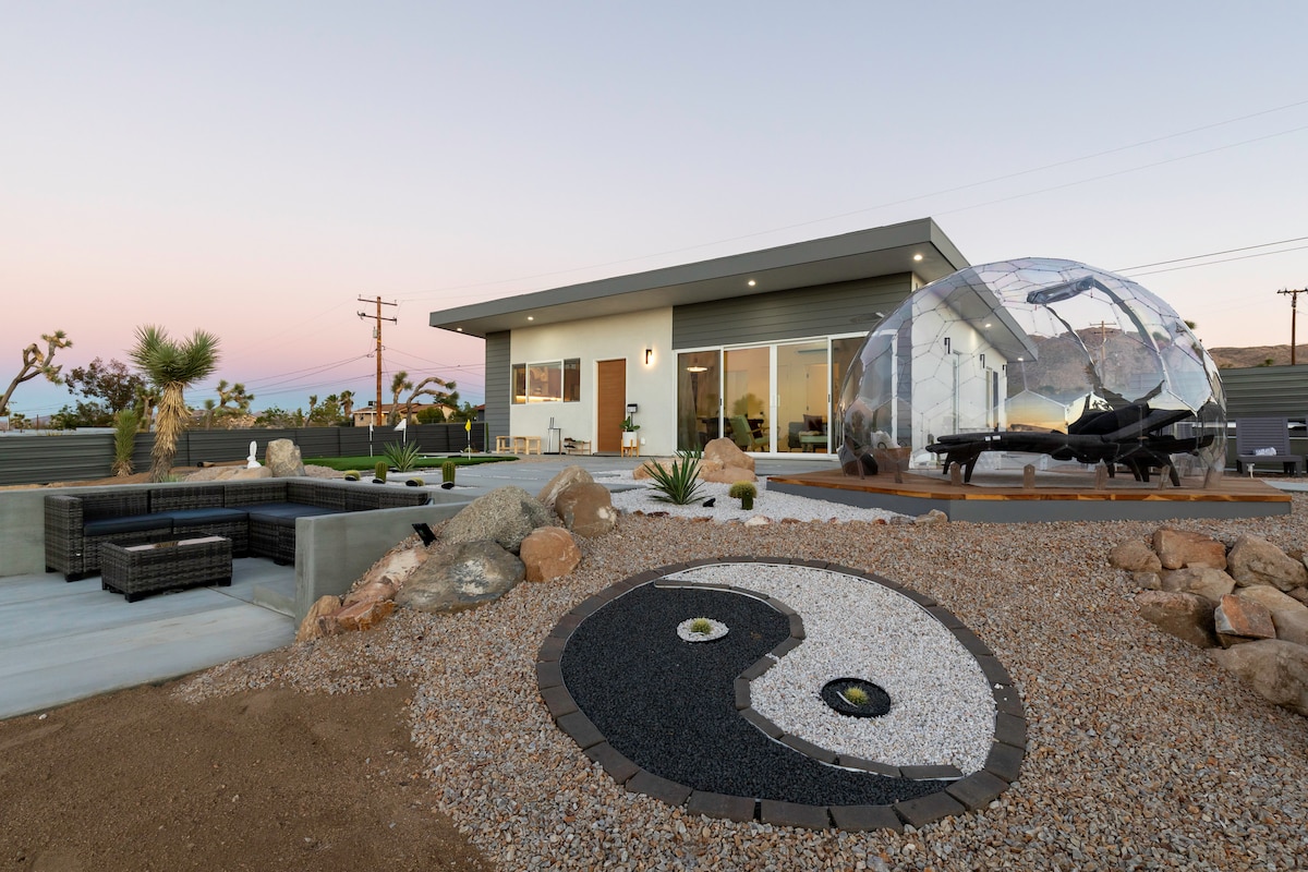 “Sphere In The Rocks” desert retreat w. cowboy pool, jacuzzi, fire pits, daybed, dining & BBQ! ★ “A magical space that encourages connection, reflection, and presence.”❤️ ✔️Architectural sound healing sphere ✔️ Recommendations → Concierge Chef & Sound Bath (ask us!) ✔️Fully equipped + stocked kitchen ✔️Reverse osmosis water filter ✔️Parking → driveway (4 cars) ✔️50 Mbps wifi + workspace ✔️Outdoor shower + tub + fire 3 mins → Joshua Tree National Park Entrance 10 mins → Downtown Joshua Tree