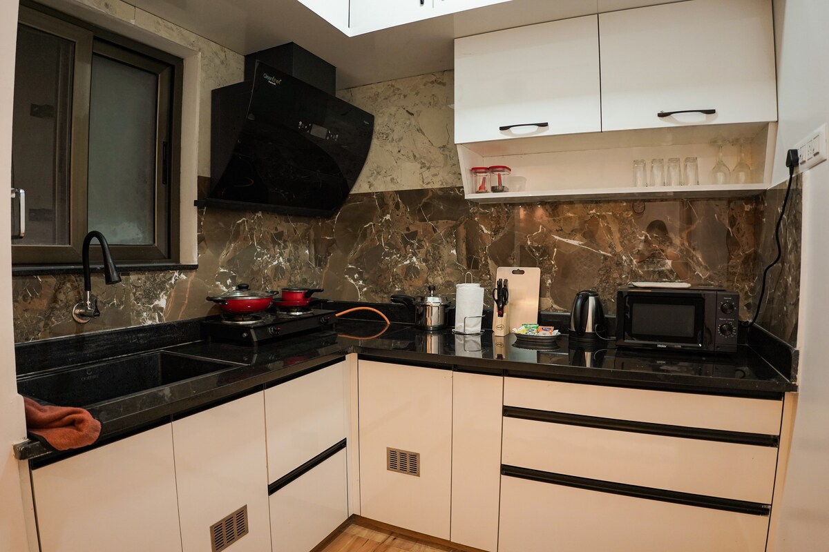 Welcome to our newly renovated, spacious 1-BHK flat, ideal for couples and families seeking comfort and convenience. The bedroom boasts a queen bed and soft orthopedic mattress for a restful night's sleep. Relax in the large living room with a 43-inch Smart TV, lightning-fast WiFi and dedicated workspace. Comes with a super clean bathroom stocked with essentials. The fully equipped kitchen includes basic ingredients, high-quality appliances, and crockery for your culinary adventures.