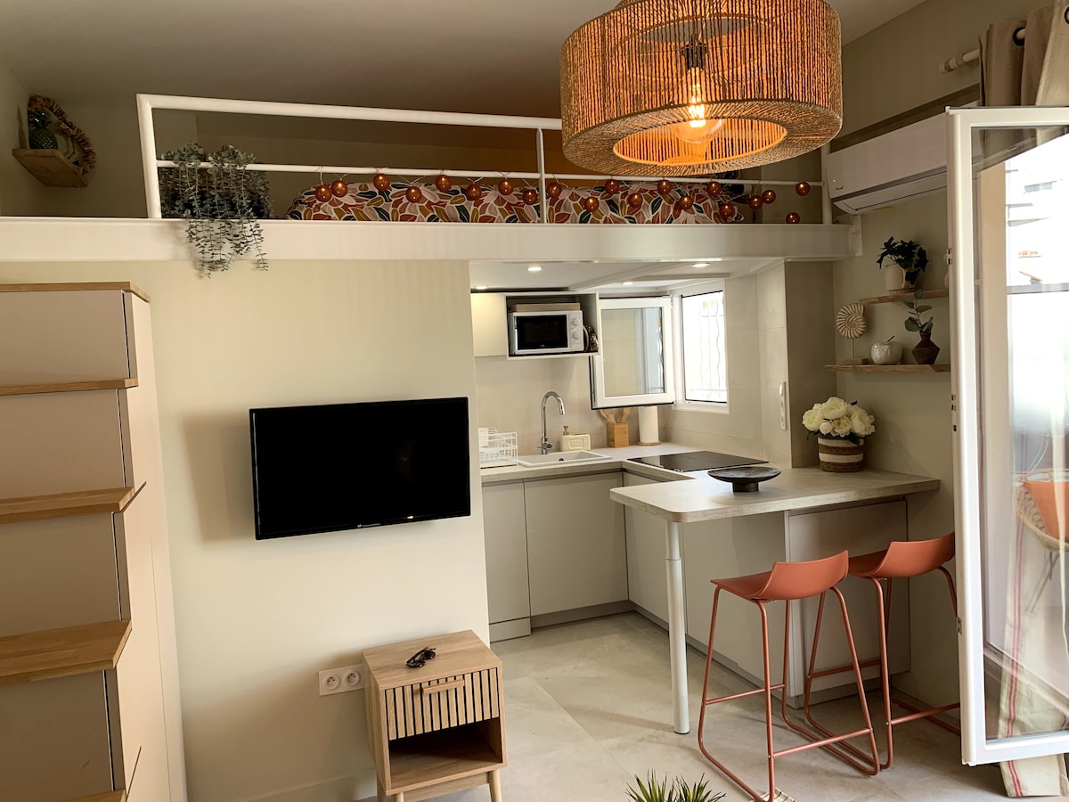 Adorable little studio of 22 m2, ideally located in the heart of Juan a few meters from the beaches and all amenities: shops, bars, restaurants, supermarket... You will also find the train station 300 m away and all bus lines to Antibes and the surrounding area. It has a pleasant open-air terrace that extends the living room. It is equipped with air conditioning and free Wi-Fi, double glazing, washing machine. Linens are provided, beach towels upon request.